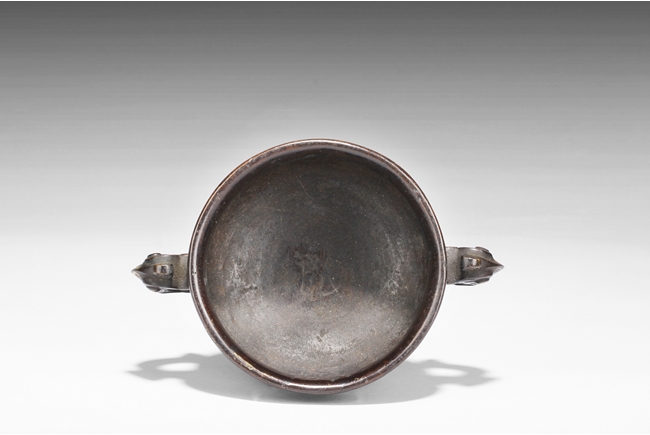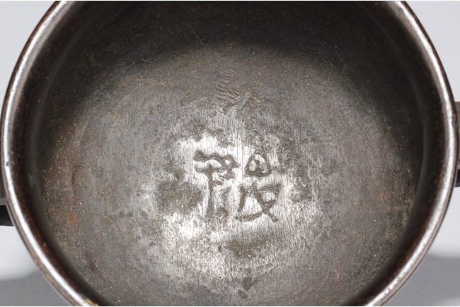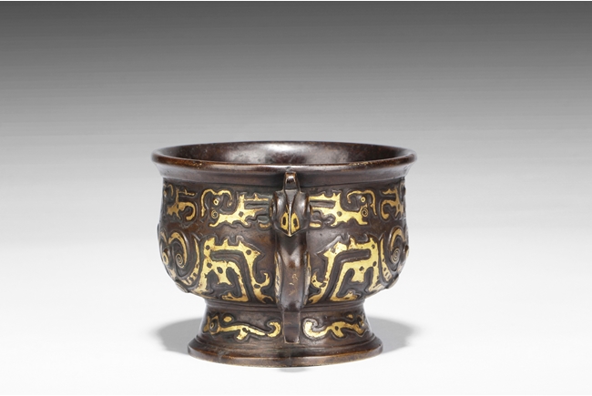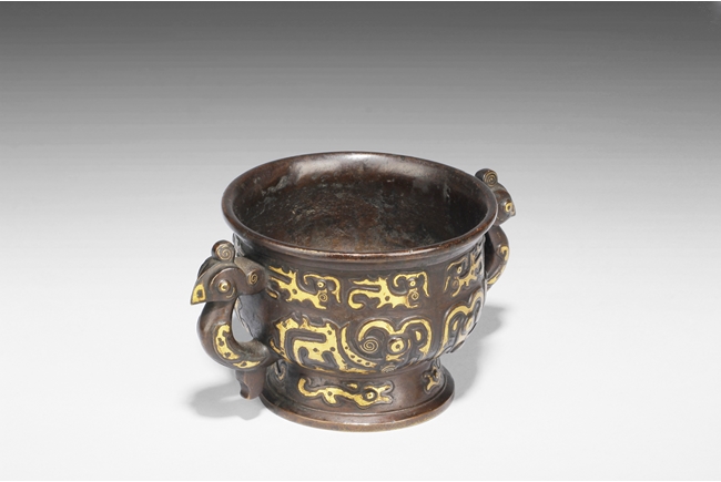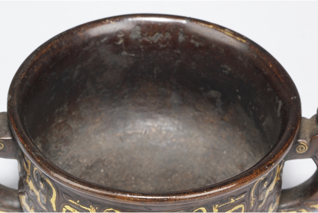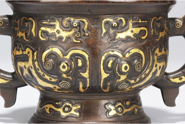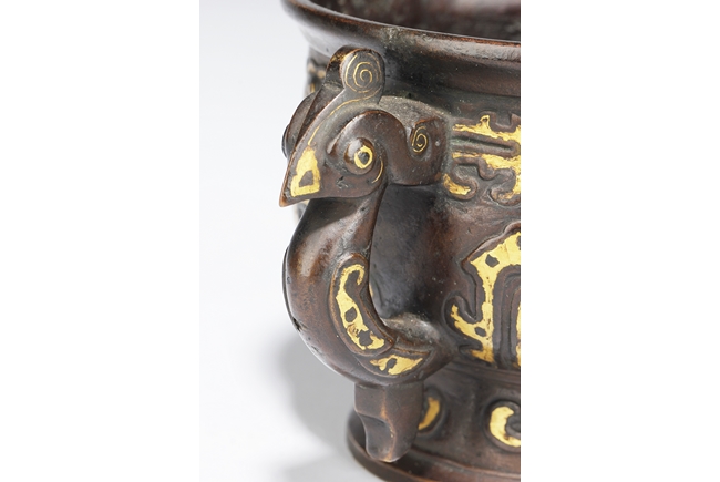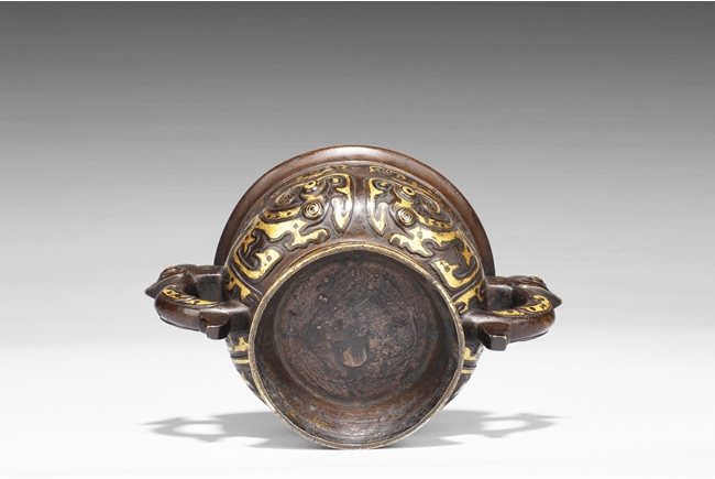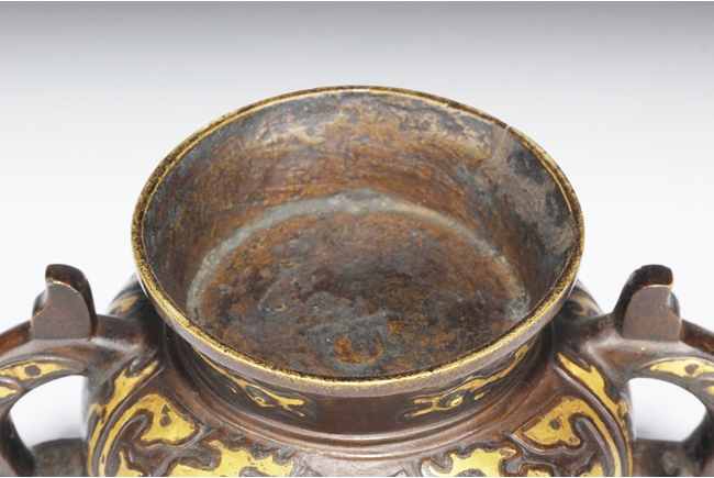 The censer of bulbous form, supported by a cone shaped foot ring slightly splayed at bottom, with flaring rim at top, the body gilt with archaistic styled patterns of animals, a pair of phoenix handles on the side. Inside lightly engraved with a Chinese character mark. Ming Dynasty period