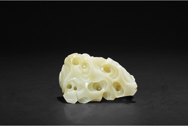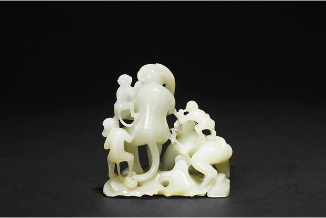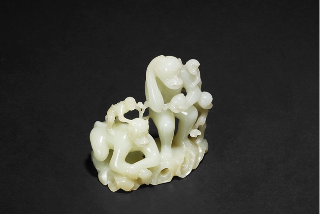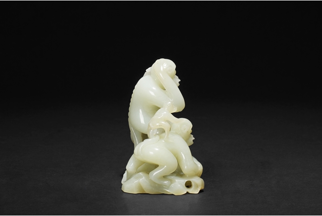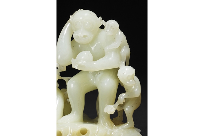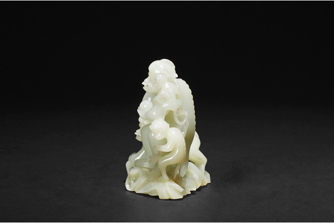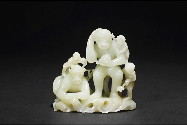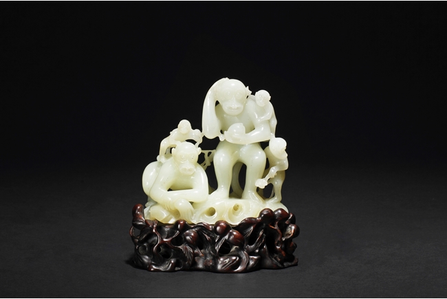 The stone of smooth creamy white color, finely pierce carved showing a large monkey carrying a small monkey on the left side, and a standing large monkey holding a peach, with two smaller monkeys on the side. Includes original wood carved stand in the form of peaches, branches, and leaves. 19th century