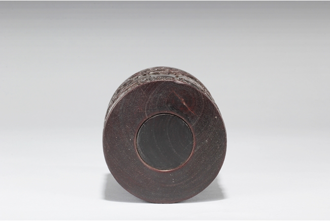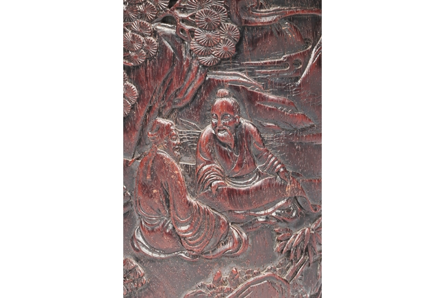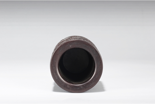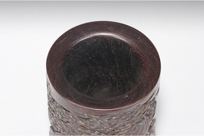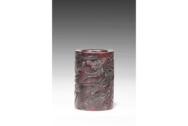 Of cylindrical form, the brush pot low-relief carved with two seated elders conversing in forest setting, and two cranes standing in river bank, with pine trees, mountains, and rock-works in the backdrop. The Zitan wood brush pot with natural color, grains, and texture, and comes with en-suite plug on the bottom. Qing Dynasty period