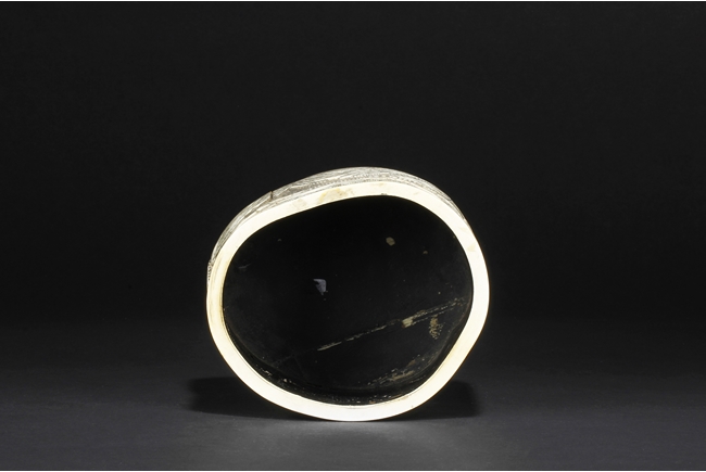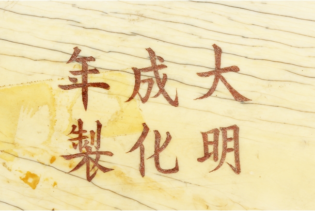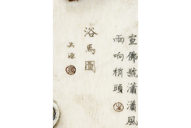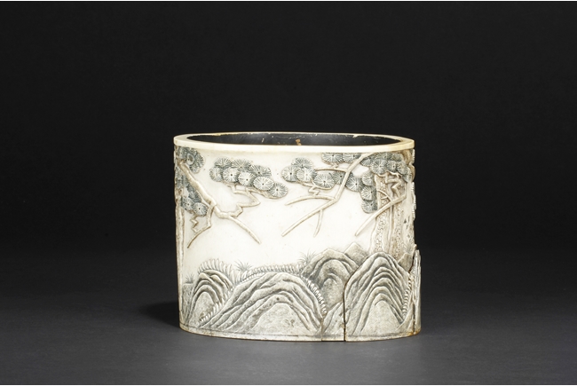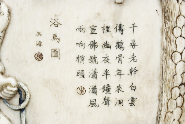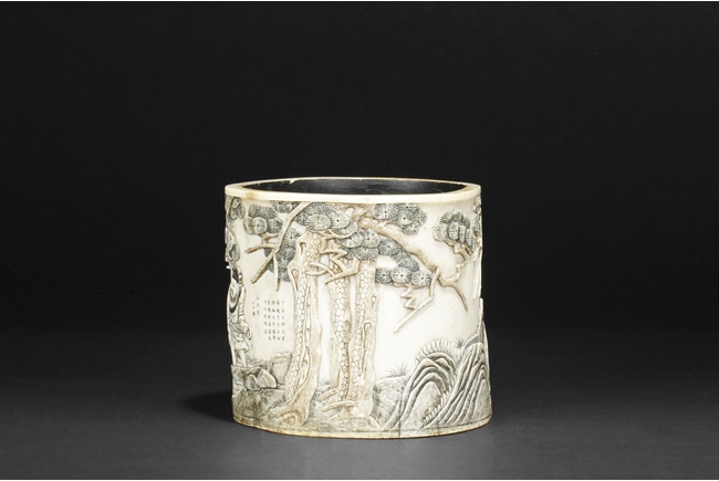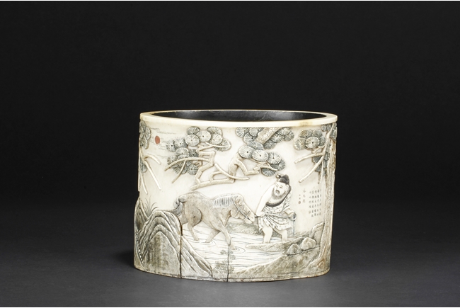 Of cylindrical form, the brush pot low-relief carved with a bearded man leading a horse to river for a bath, surrounded by pine trees, hills, and rock formations, Chinese poem, artist signature and mark next to the man, six character “CHENGHUA” mark on the bottom. Visible cracks present on the brush pot, due to age. Qing Dynasty period