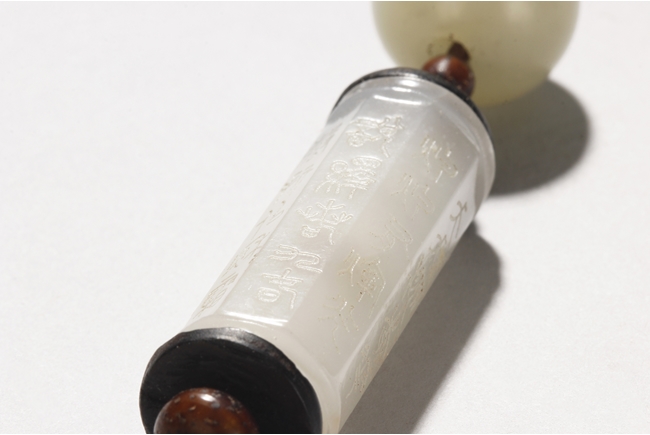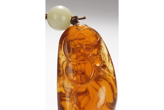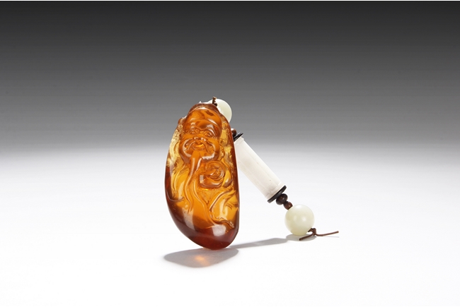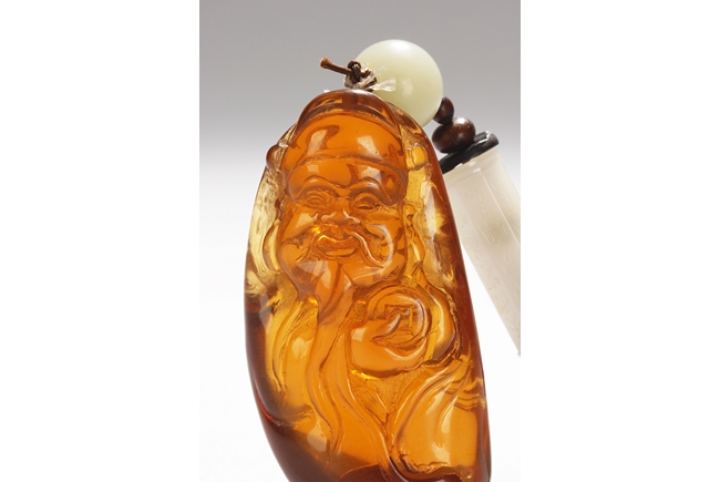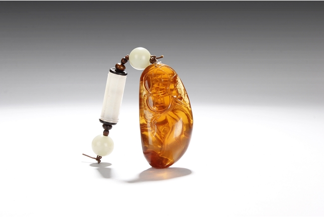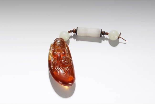 The amber carving depicts a Shoulao with long beard and serene expressions, right hand holding a large coin, and carrying two more large coins on the back, the amber of alluring honey color with good transparency. Two white jade beads and an octogonal bead, each side carved with Chinese colophon. Total weight 64 grams. Qing Dynasty period