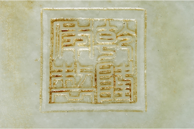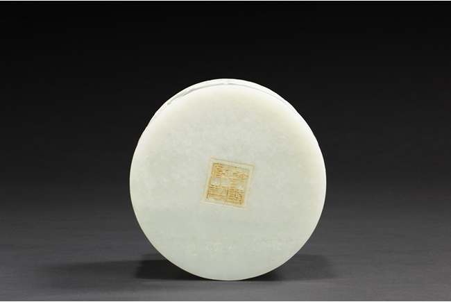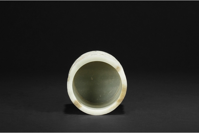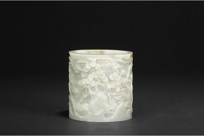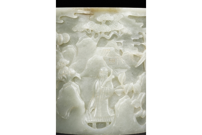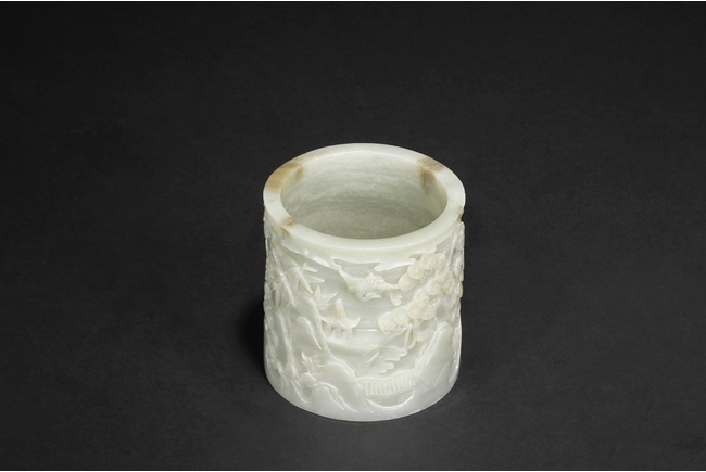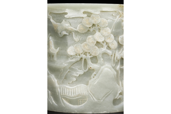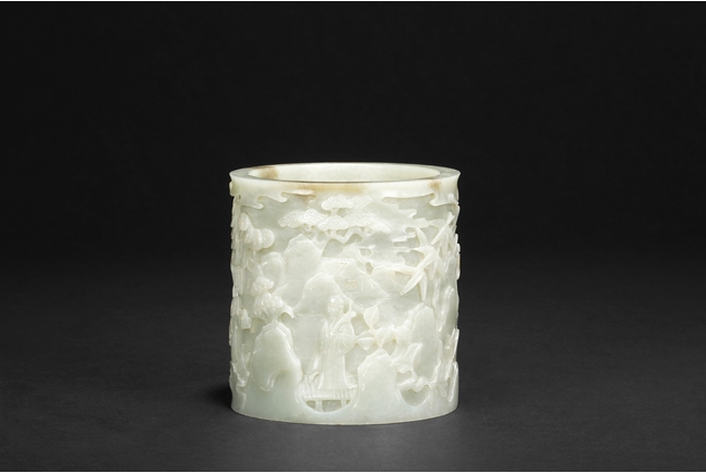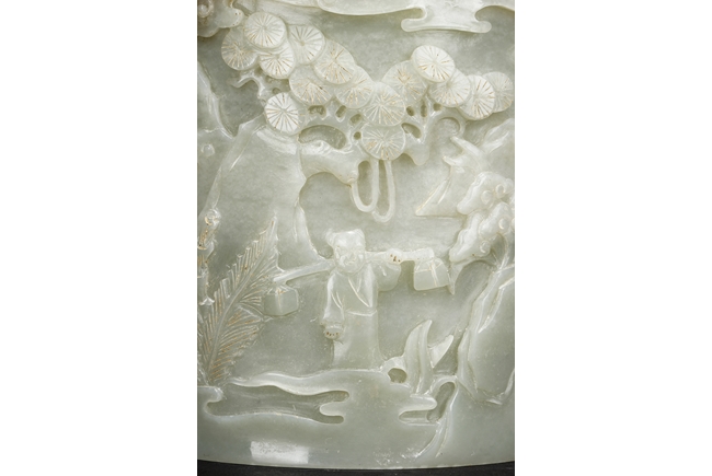 Of cylindrical form, the exterior low relief carved with a man walking on the bridge amidst dense forest, towards a young boy carrying a shoulder pole balanced with two boxes under pine trees, background of hidden house amongst tall mountains and clouds. Bottom bears four character “QIANLONG” mark. 19th century