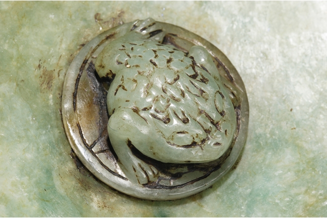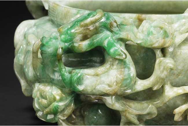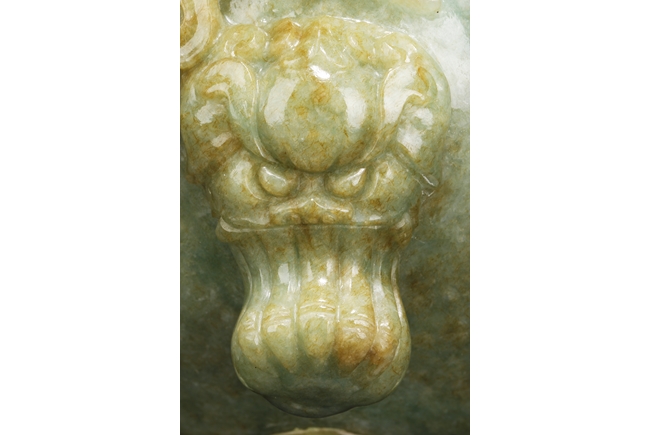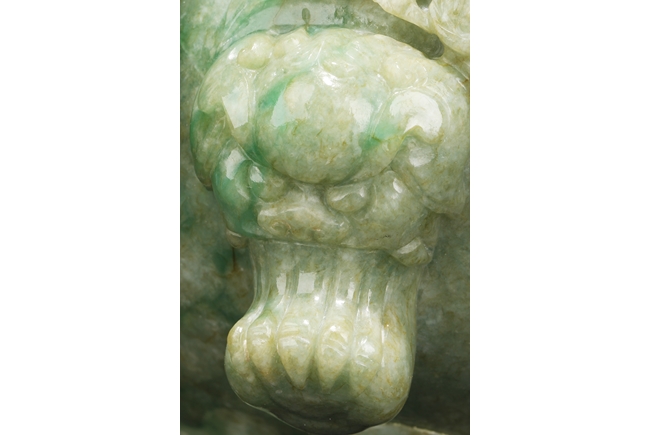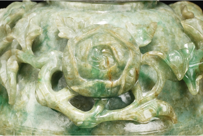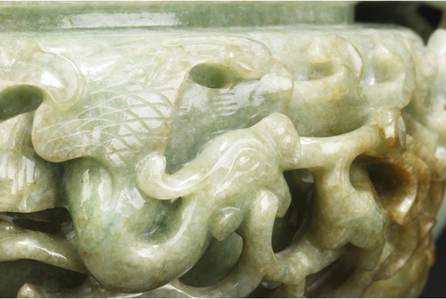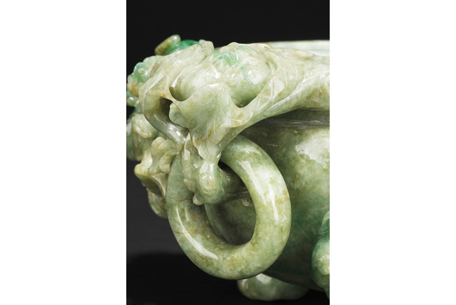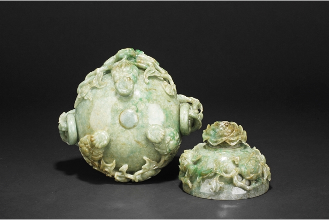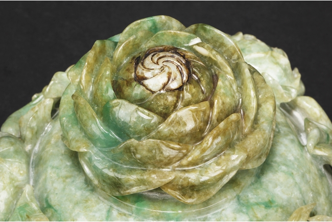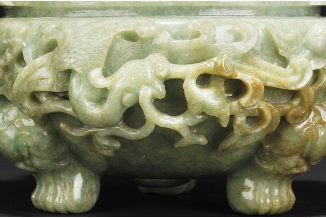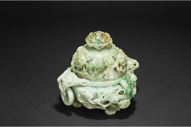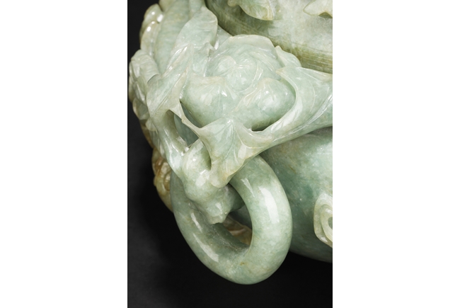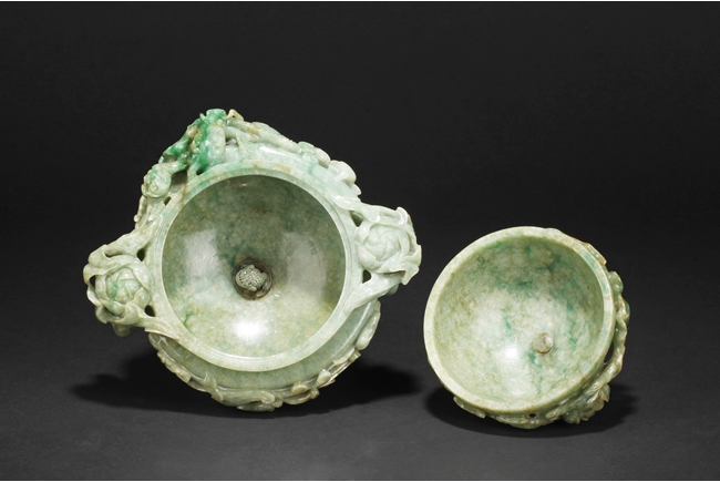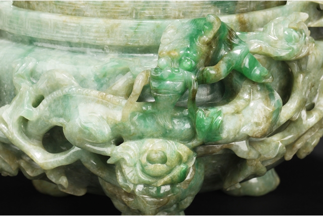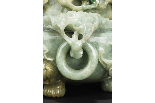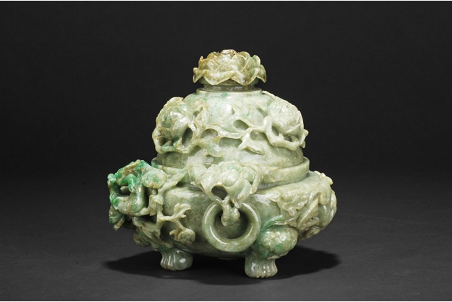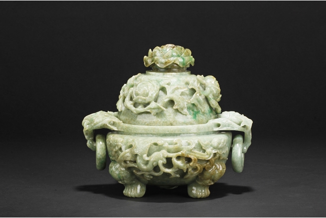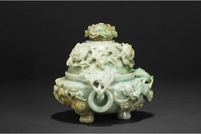 The compressed globular censer with prominent dragon-head handles suspending substantial loose rings, the short cabriolet legs emanating from lion masks, the body carved in relief with flying dragons and lotus flowers, the domed cover carved with blossoming flowers with vine and leaves, the finial carved a large flower. The stone of white color with apple green inclusions and small areas of russet, with some transparency. Qing Dynasty period, Qianlong era.