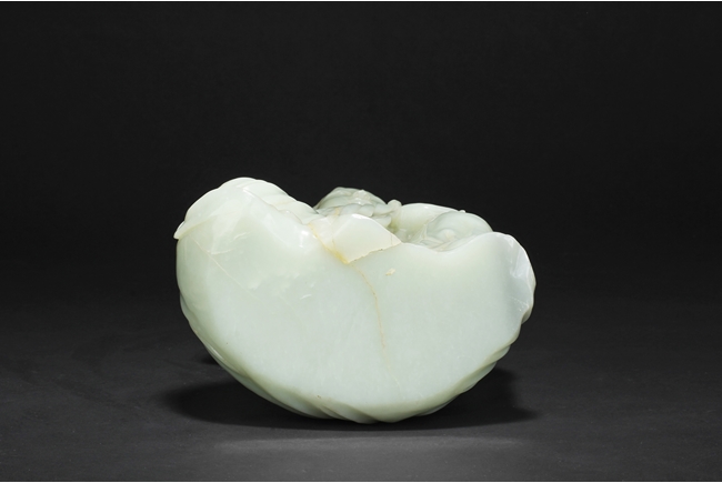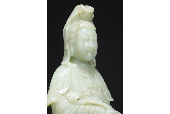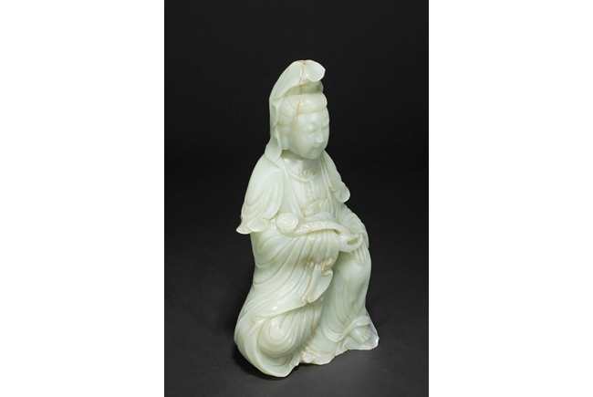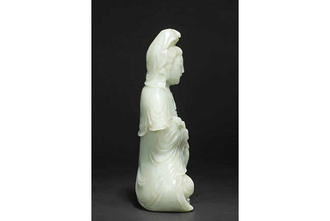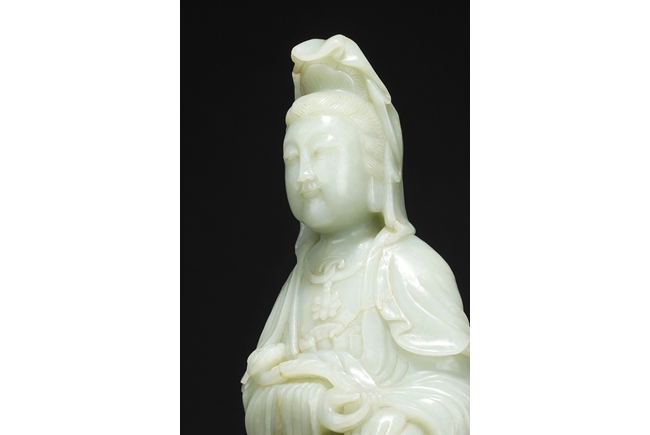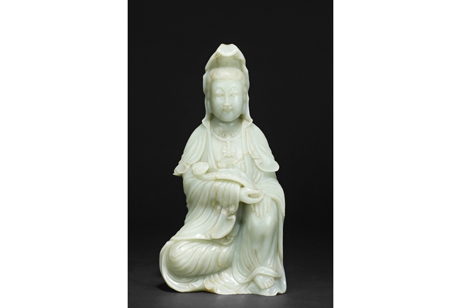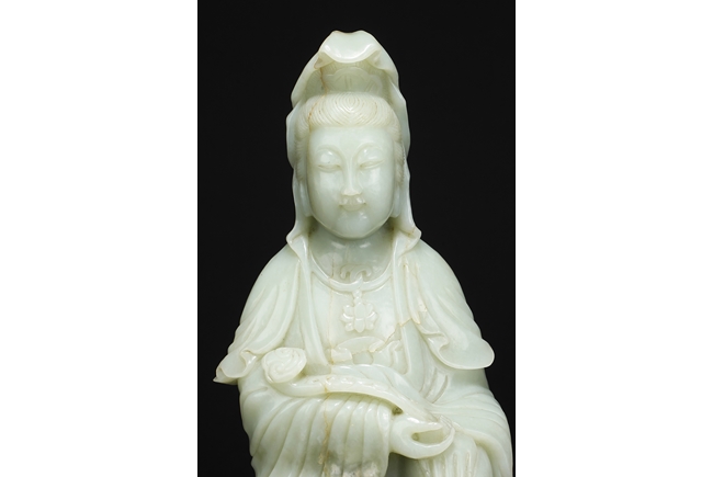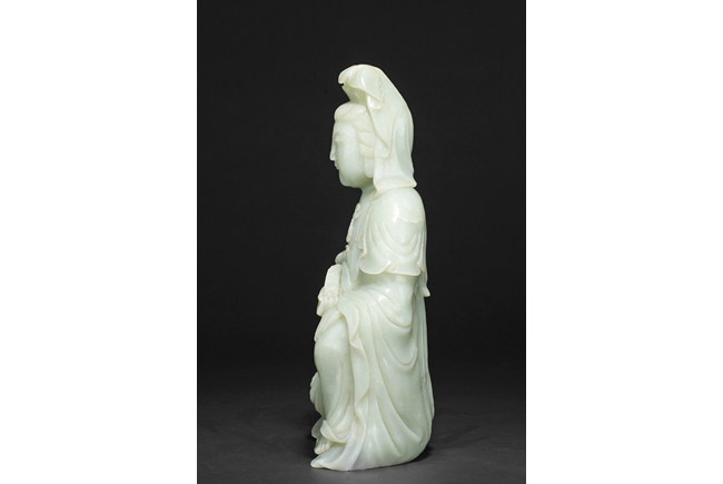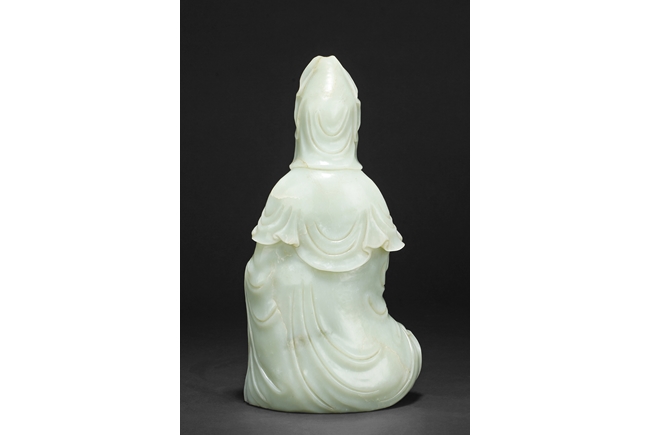 The Guanyin is seated while dressed in long flowing robe, the left hand resting on the left knee, and the right handing holding a ruyi scepter sideways, a lotus pendant shown near the chest, the face with serene expression, eyes closed. The stone of semi-transparent pale grayish-green. Qing Dynasty period