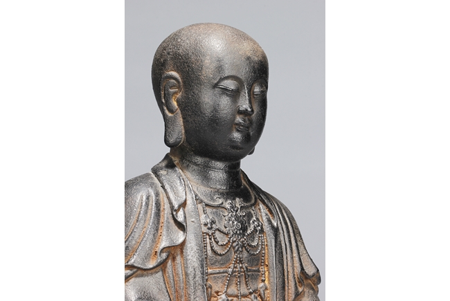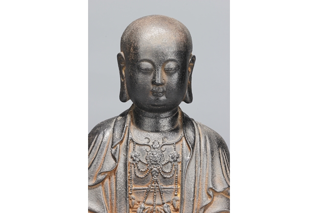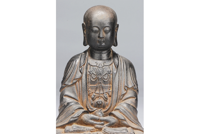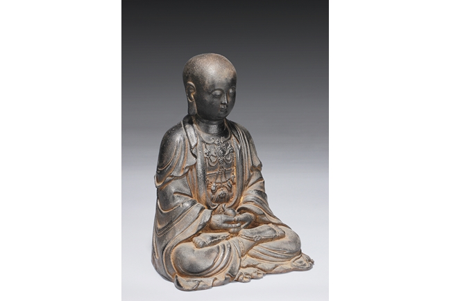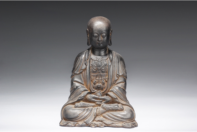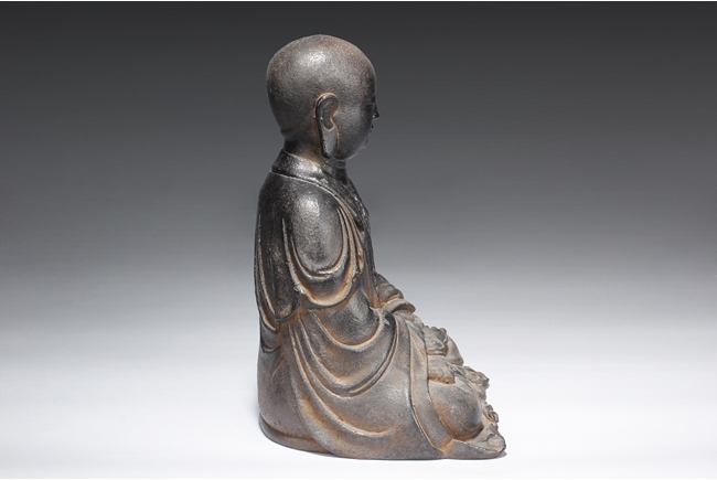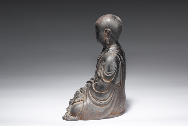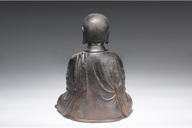 A Qing Dynasty well casted iron monk statue. He sits in meditation with his hands joined in dhyana mudra, the surface is well worn due to many years of handling. Qing Dynasty period