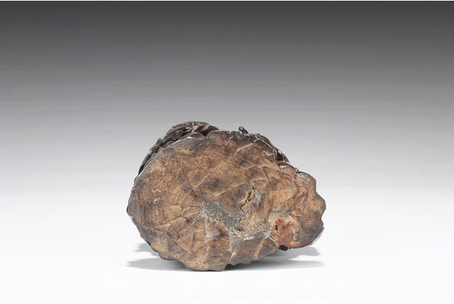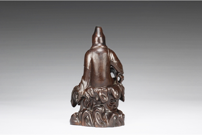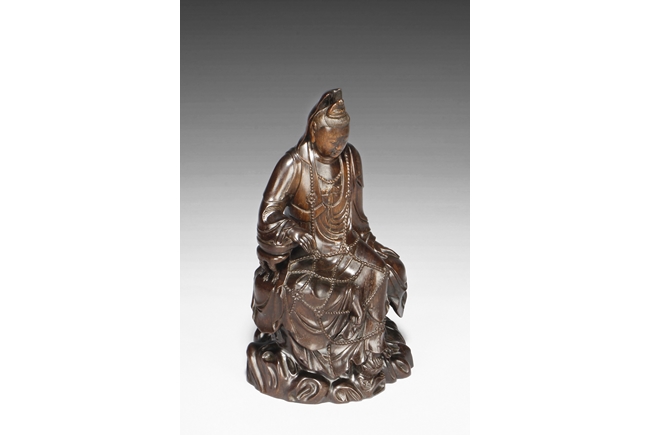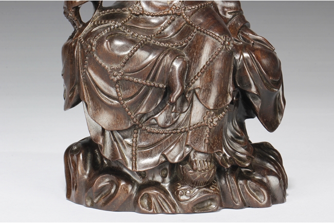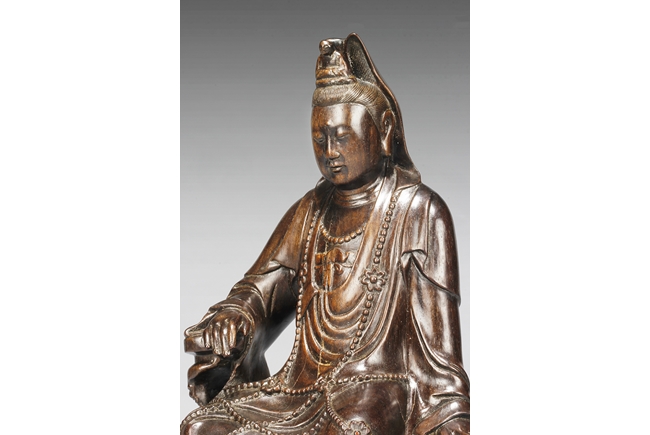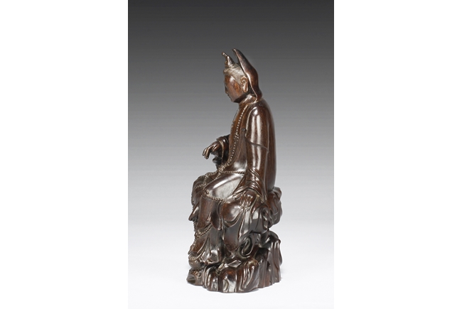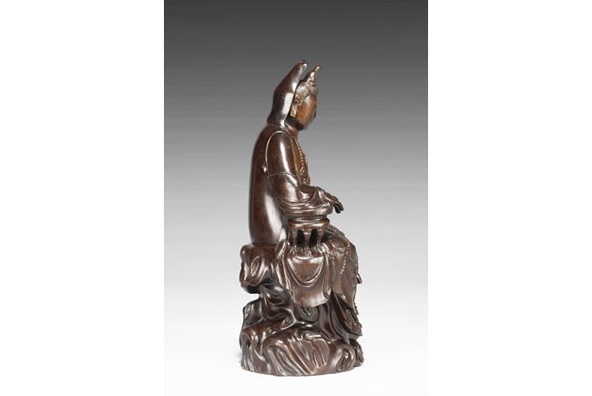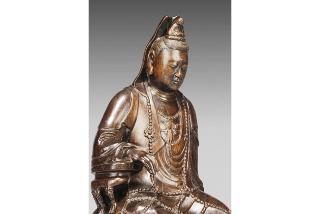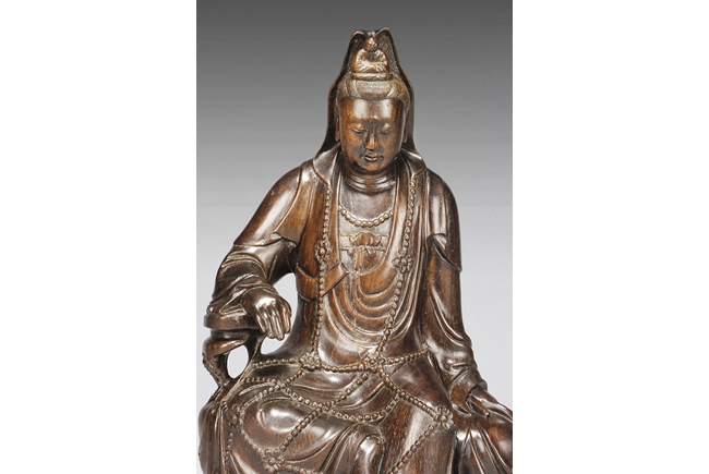 Seated in lalitasana on top of a wooden trunk, draped in long robe flowing freely with chest slightly exposed showing ornate necklace, right hand rests on an extended wooden armrest, left hand rests on the side of wooden trunk, face with serene look and eyes closed, a small Buddha seated on top of the hair knot. The Guanyin intricately carved from zitan wood, with natural color and grains. Qing Dynasty period