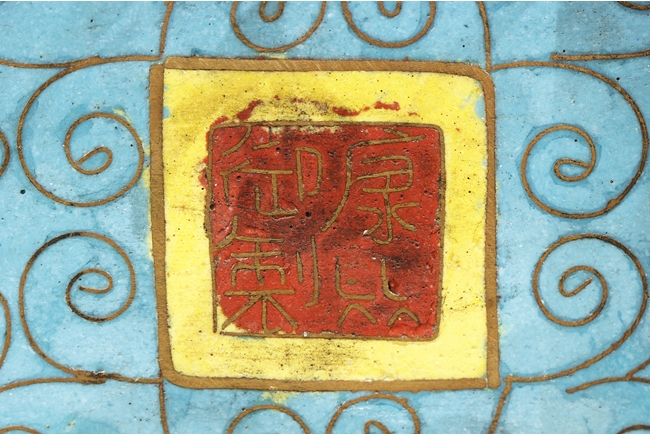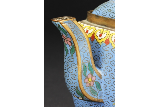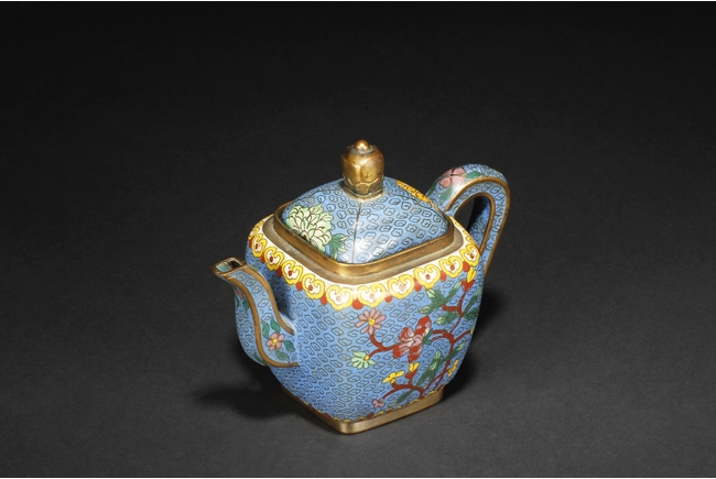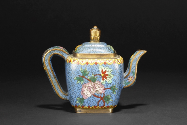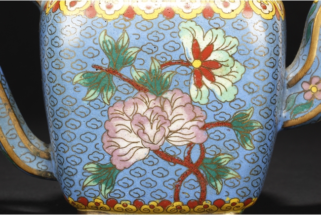 Of round square form, the body supported by a square foot ring, with large handle extending from near base to shoulder, the spout curved slightly extending from the middle of body, the body depicts blossoming peony flowers, leaves, and branches on top of teal background filled with small cloud patterns, between scrolling ruyi-head band pattern and scrolling ruyi-head cloud pattern, the bottom bears four character “KANGXI” mark. Republic period