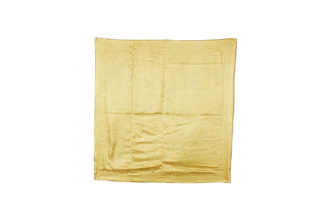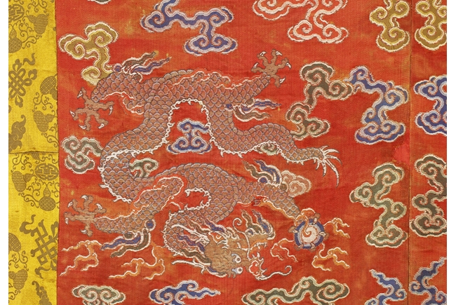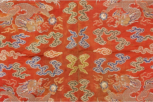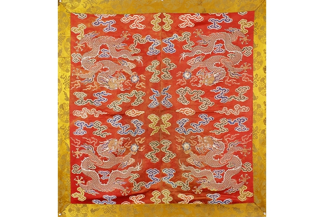 The embroider cushion is worked in shades of red, blue, white, gold, and green, with four five-clawed dragons each chasing a flaming pearl amidst colorful clouds against red silk, with gold brocade border depicting roundels of double gourds surrounding a center “Shou” character and other auspicious items. Qing Dynasty period