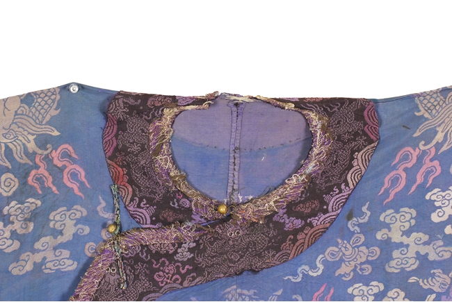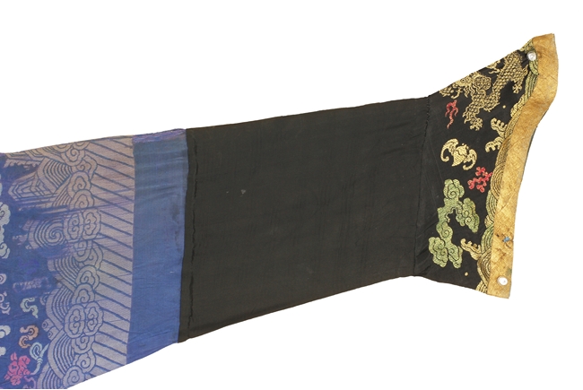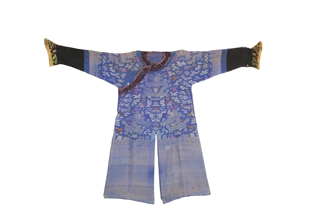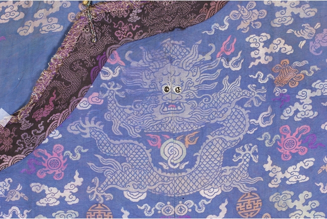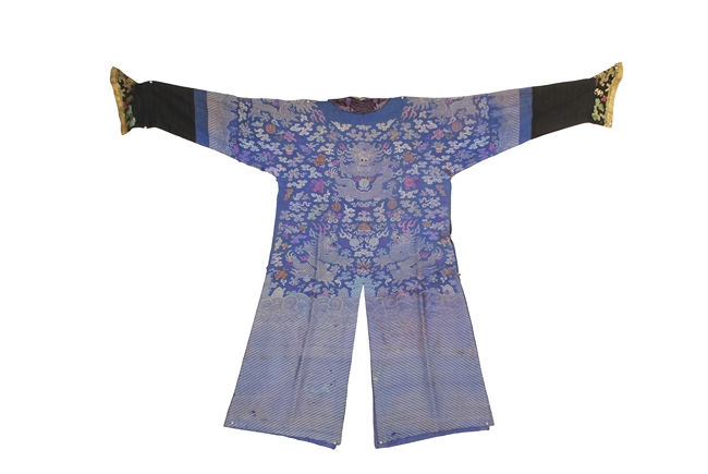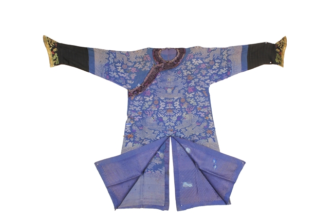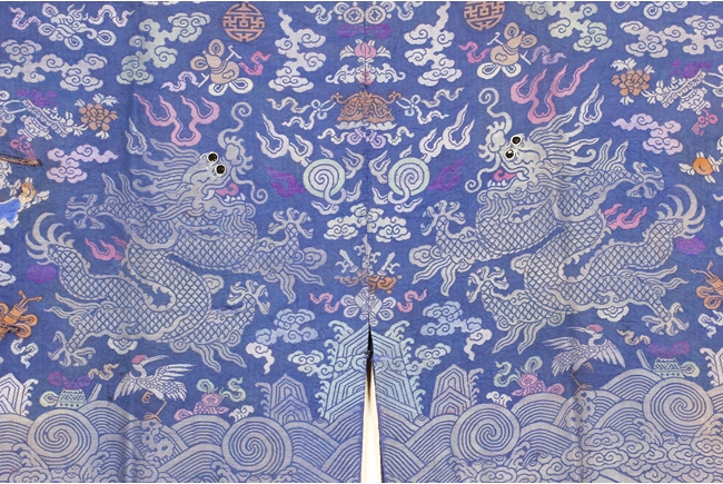 The blue robe is embroidered in shades of blue, red, yellow, green, and white, depicts multiple flying five-clawed dragons with flaming spheres amidst stylized clouds, auspicious symbols, and above the lishui pattern at the bottom of the robe, the cuffs stitched with flying gold dragon and auspicious symbols. Qing Dynasty period