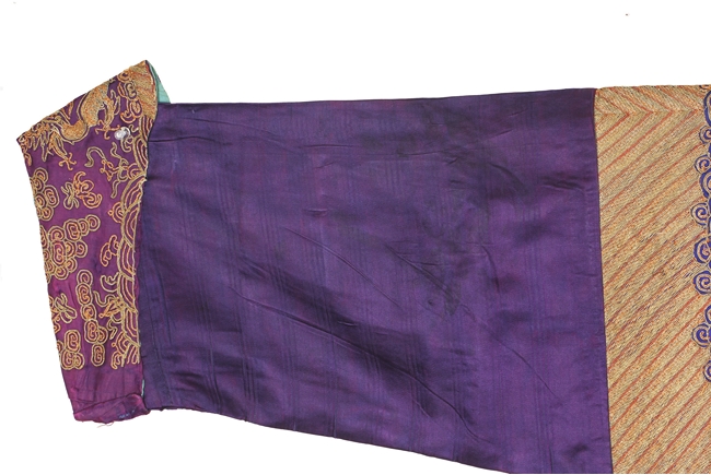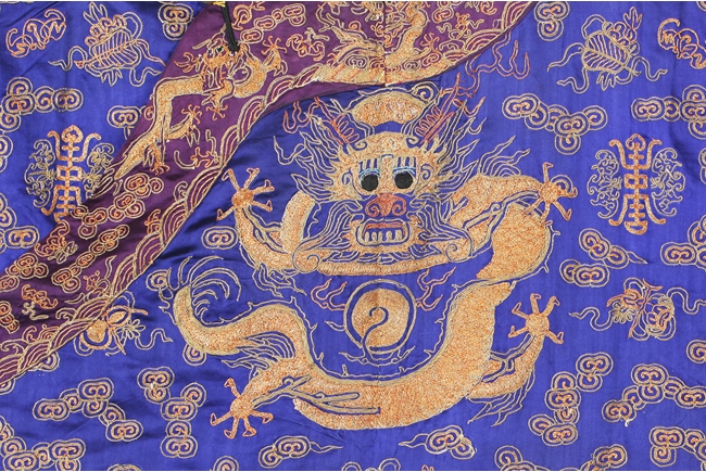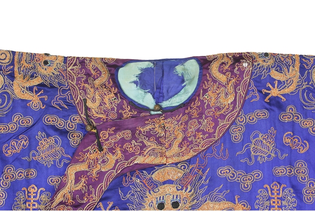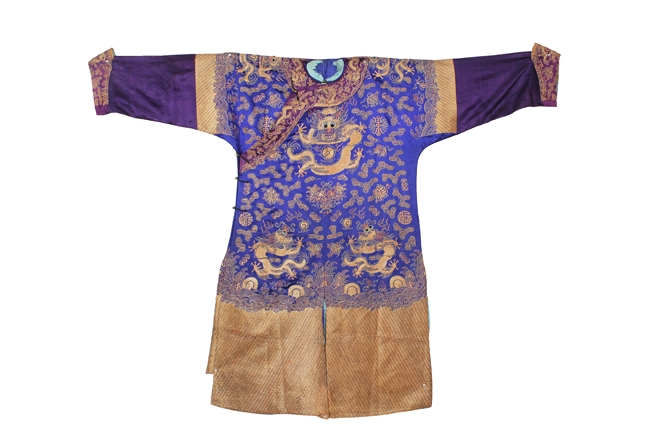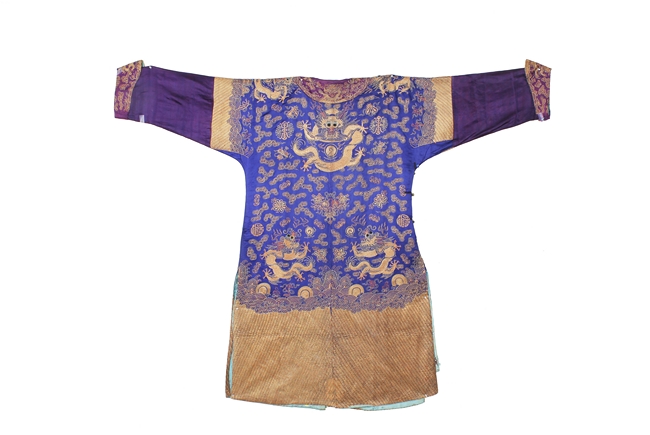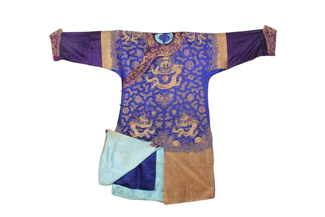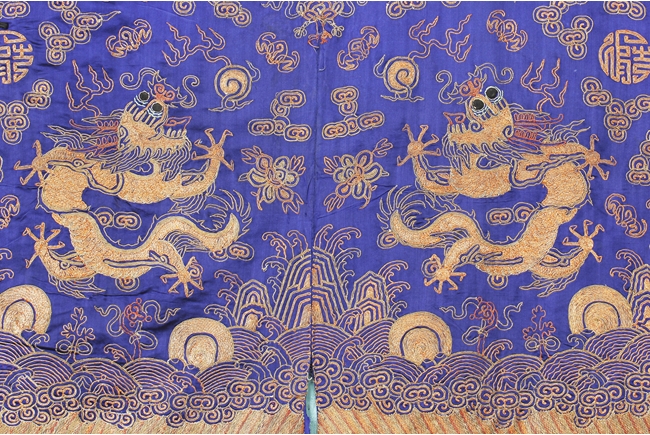 The blue and gold robe is embroidered in shades of blue, gold, and purple, using gold thread to stitch multiple flying five-clawed dragons chasing flaming spheres amidst stylized clouds, auspicious symbols, lishui patterns on the bottom and near the purple sleeves, the cuffs with similar design. Qing Dynasty period