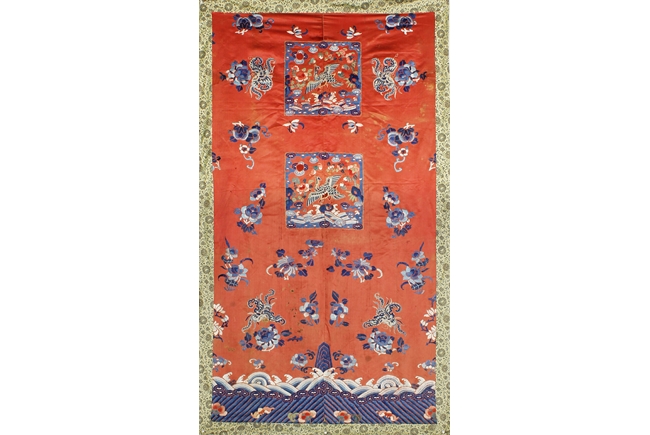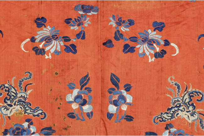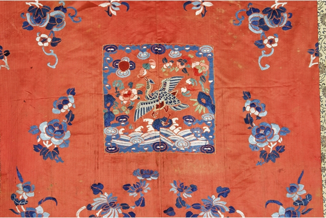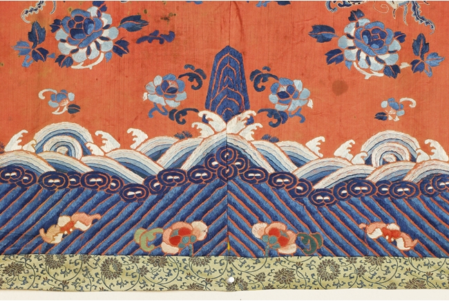 The embroidery is worked in shades of red, blue, white, gold, green, and black, with peony flowers covering most of the surface, two squares encircling a flying bird amidst peaches, flowers, bats, clouds, and ocean waves stitched to the top and center, border stitched with chrysanthemum flowers and vines in gold. Qing Dynasty period