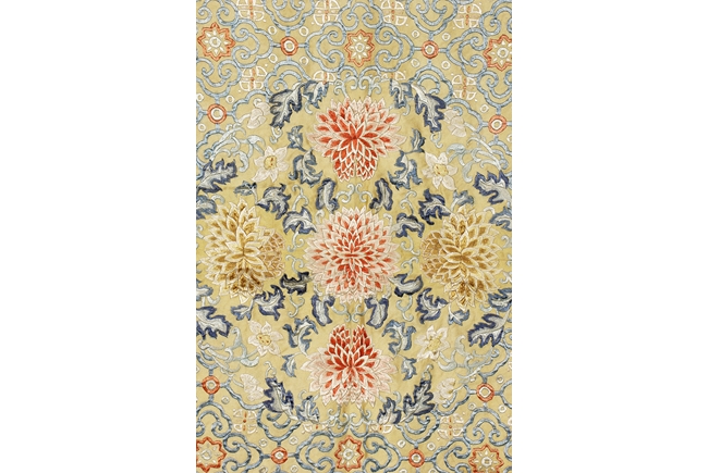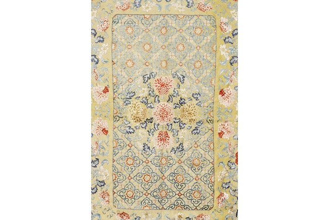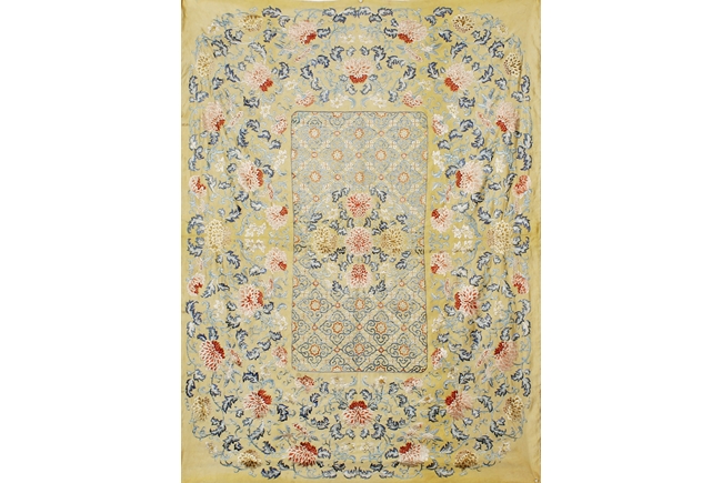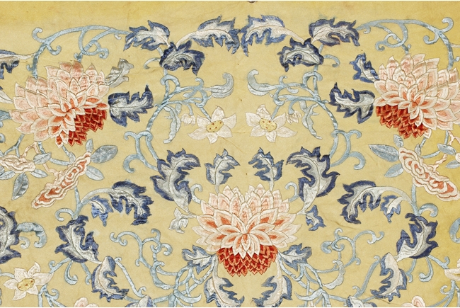 The embroidery is worked in shades of yellow, red, blue, and white, the center with five peony flowers with vines and leaves, surrounded by ruyi-patterned diamonds filled with additional flower, linked by red and white flowers, enclosed in a long rectangle, the remaining area embroidered more peony flowers in red and yellow. Qing Dynasty period