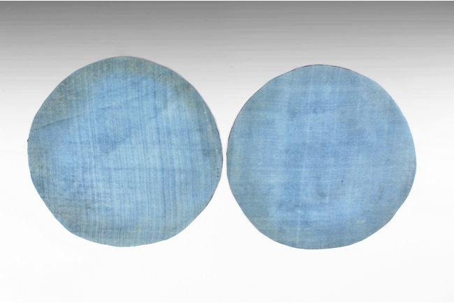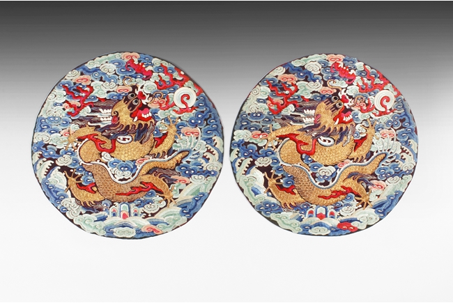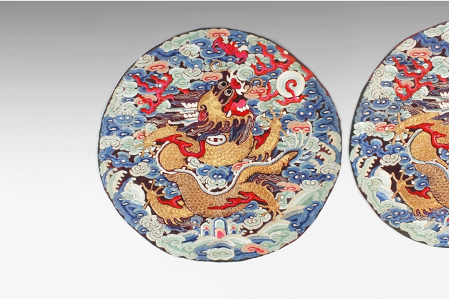 The pair of embroidered round badges used gold, red, blue, cream, and black threads, each depicting a golden five-clawed dragon flying amidst ruyi-clouds and bat chasing after flaming pearl, above the ocean waves, the reverse in blue threads. Qing Dynasty period