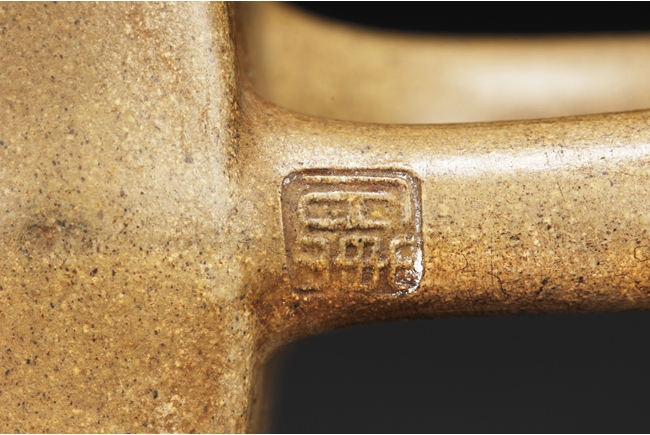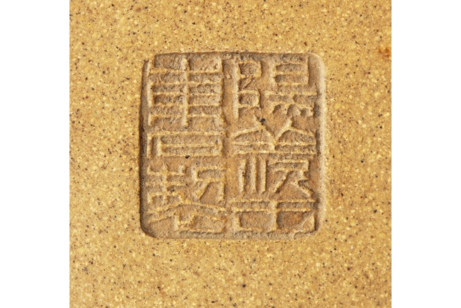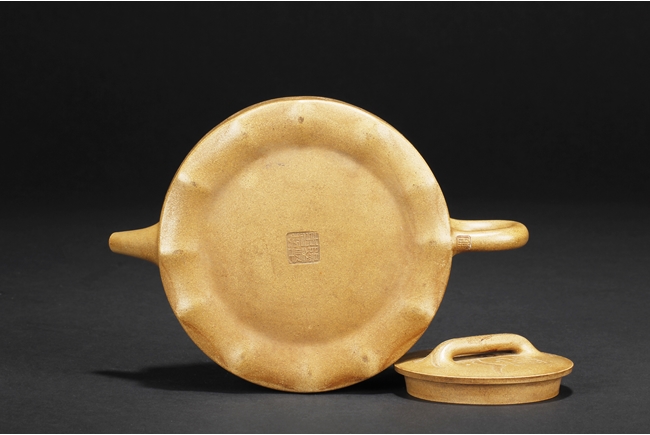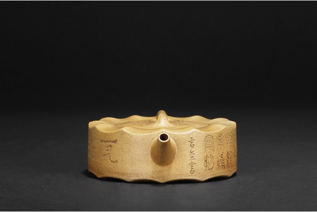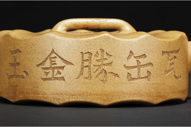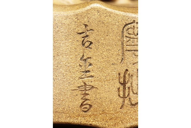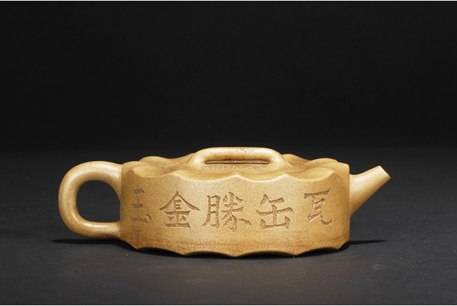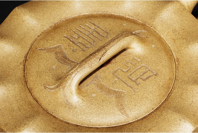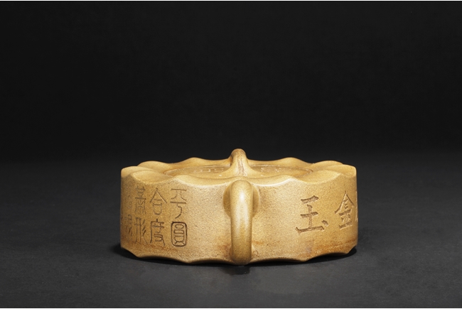 此壺黃泥扁圓,上下均有十二道凹凸線條,寓意合度、合時、合宜、合規,方能延年益壽,刻有瓦罐勝金玉、吉金書,陽羡王東石製。王東石與何心舟等均為浙寧玉成窯的創始者。