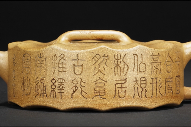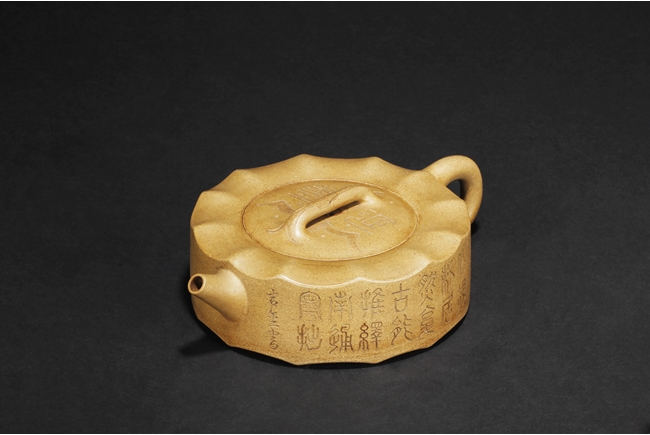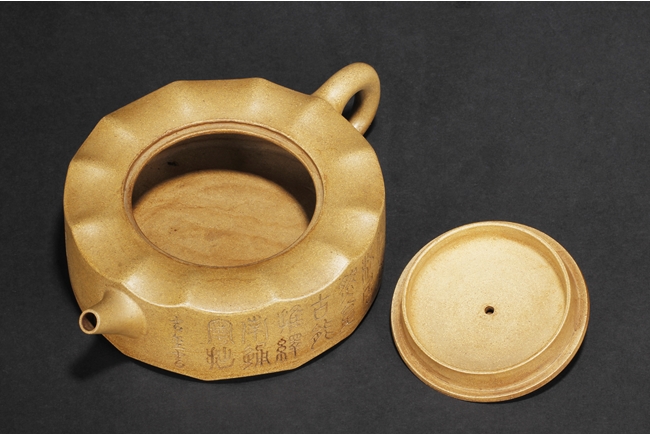 Of flattened cylindrical form, the shoulder and bottom with twelve raised segments, signifying longevity, the side engraved with poem and title, the lid with two character mark, bottom of handle with two character “Dong Shi” mark, bottom of teapot with four character artist mark. Wang Dongshi and He Xingzhou were both the founder of Jiannin’s Yucheng kiln. Late Qing Dynasty period