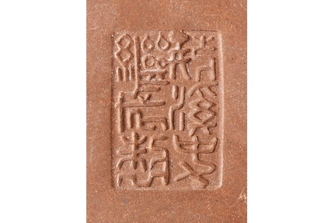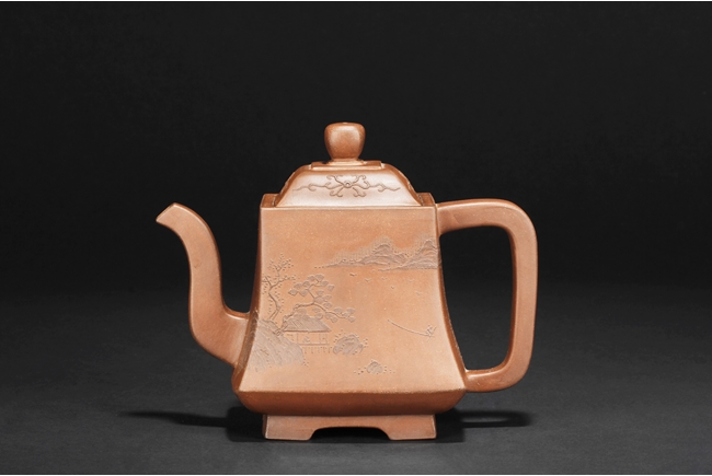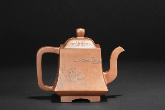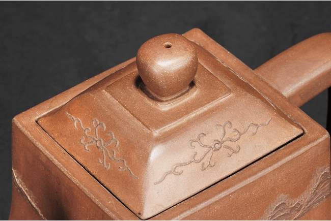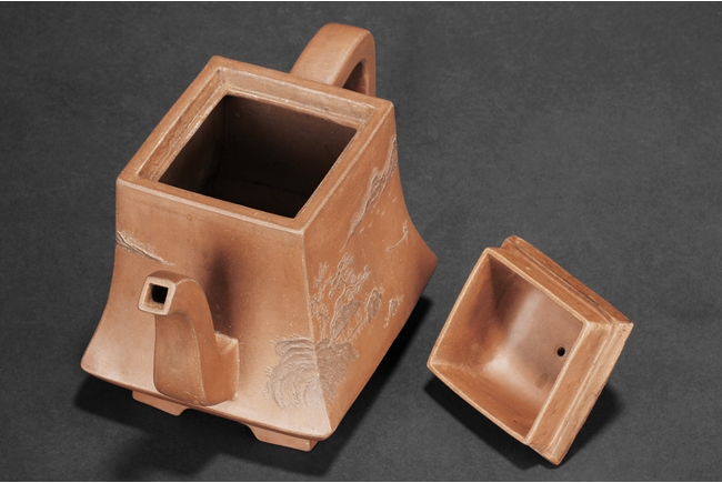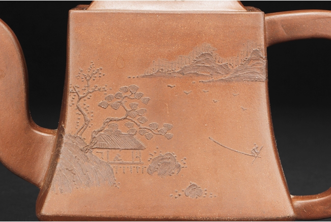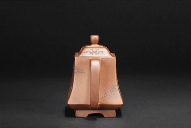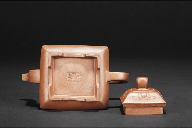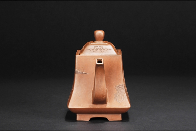 此壺成四方形,四挖足,方形嵌蓋,三彎流,方形把,壺兩邊泥繪,亭台泛舟,遠山,飛鳥,乾隆時期特徵明顯。底有“荊溪史繼長製”篆書款。史繼長所製漢方壺有署“靜遠齋製”或書“靜遠齋繼長製”,其曾為果親王製壺,多有佳器留世。
