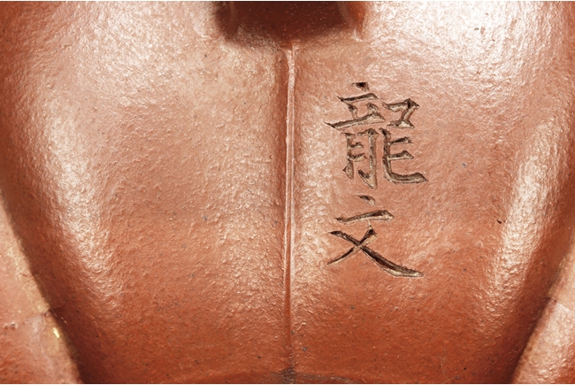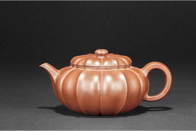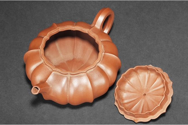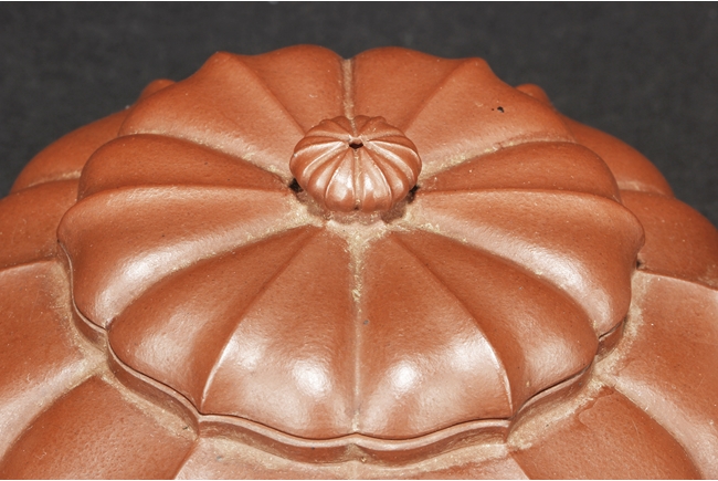Of narcissus flower petal-like form with a bulbous body, the teapot has hexagonal spout and handle, the lid can be placed in any angle, with a flower bulb shaped finial. Two character “Long Wen” mark beneath the handle. Xu Longwen (1618-1666), a famous Yixing teapot maker during late Ming Dynasty and early Qing Dynasty, mostly makes flower shaped or themed teapots.