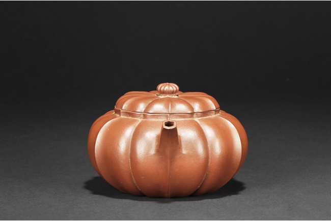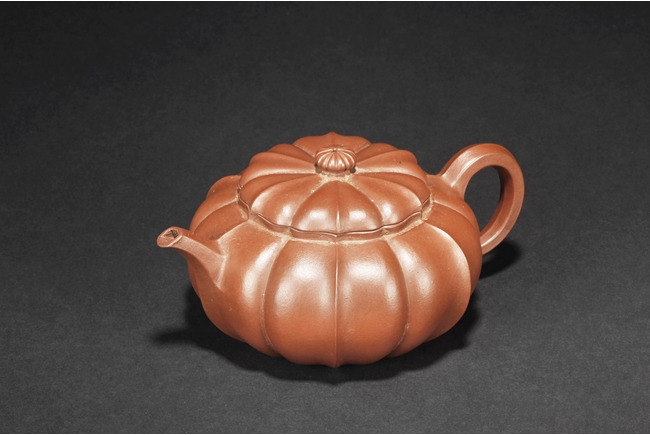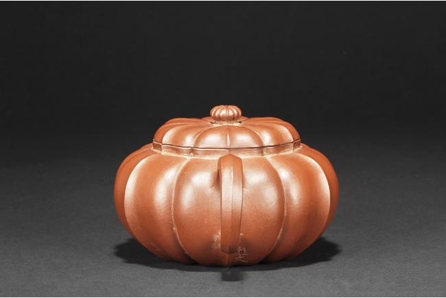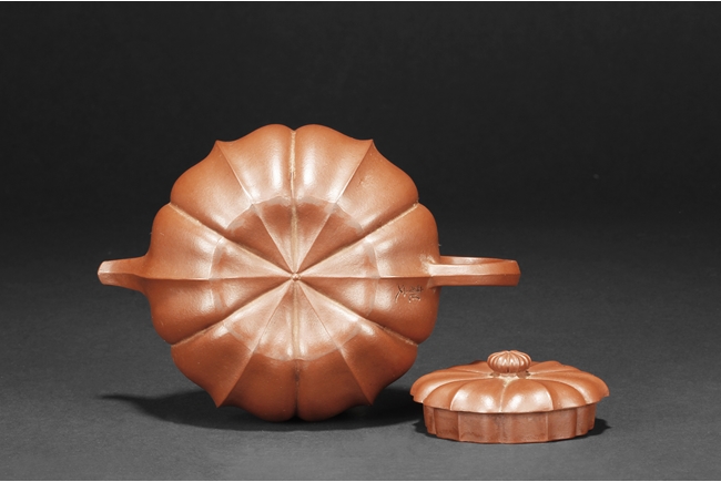 此壺圓身立面菱形,上下對稱,壺蓋可任意變換角度,通體曲綫之美,相互輝映,另人賞心悅目,另有人稱“合菊壺”,壺身近把處刻有“龍文”款。許龍文,為明末清初宜興製壺高手,生卒為1618-1666年間,所製多花卉象生壺。