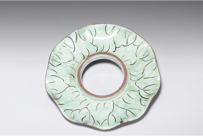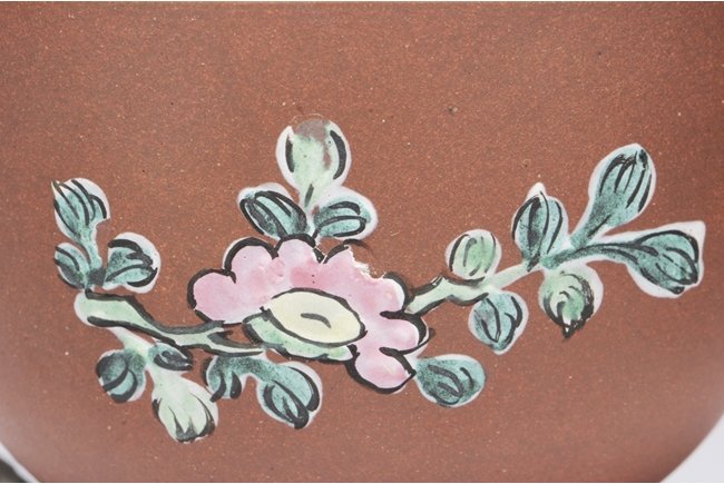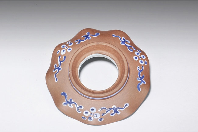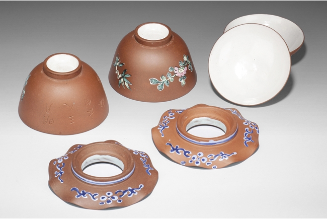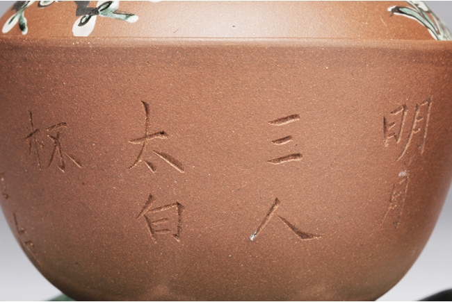 此對杯內加釉,外加彩,有墊,墊也內外加彩,杯身刻有“明月三人太白杯 子冶”。