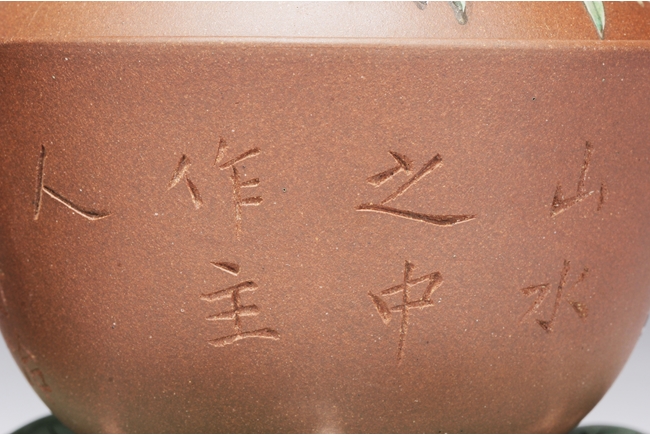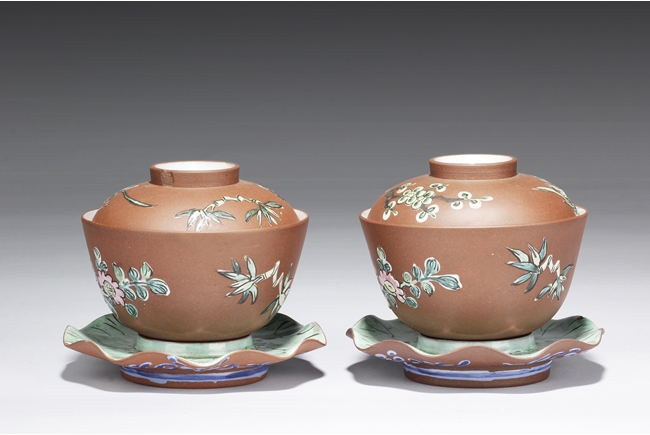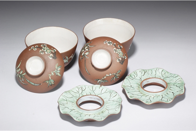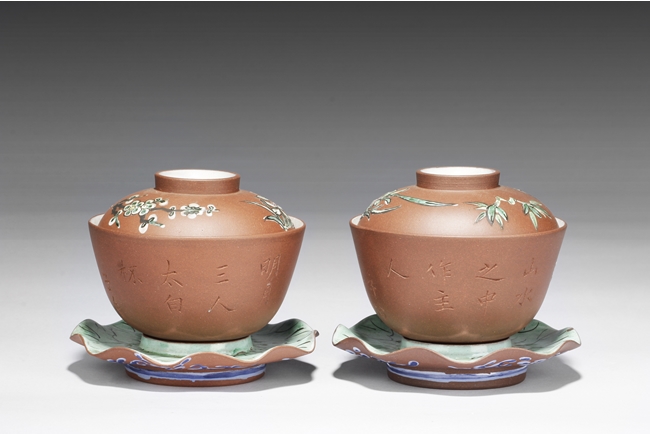 The set includes two tea cups with cover and saucer, the surface painted with flowers and bamboo, with Chinese on the side, the saucer with leaf-like color and surface, the exterior painted with blue vines, the cups’ interior glazed in white. Calligrapher signature “Zi Ye” on the side.