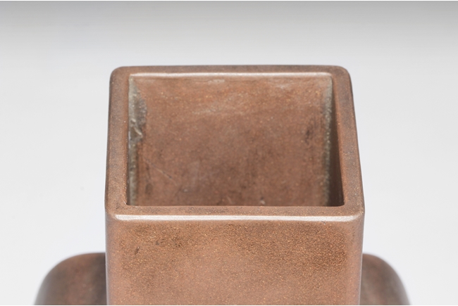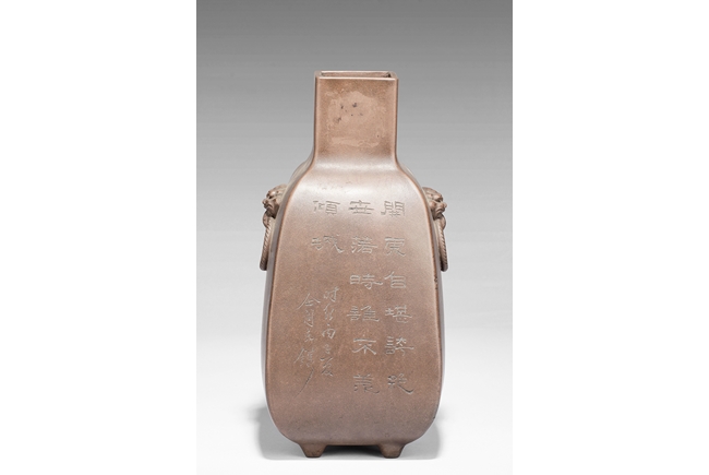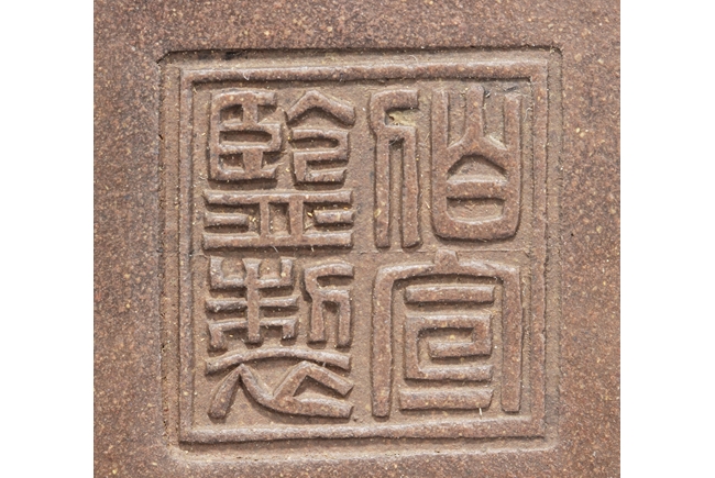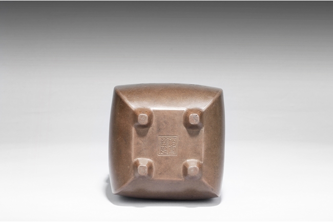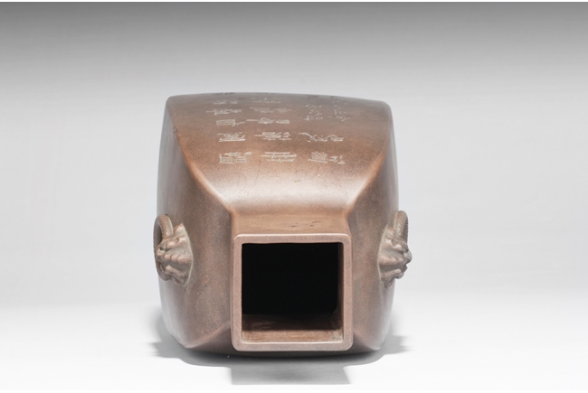 Of rounded rectangular form, the body stands on four small foot, the body carved with Chinese poem and a mountain scene, with a pair beast masks and loop ring handles on the side. Artist signature and mark “Qi Taoshi” on the body, additional mark “Bai Xian Jian Zhi” on the bottom. Late Qing Dynasty or early Republic period