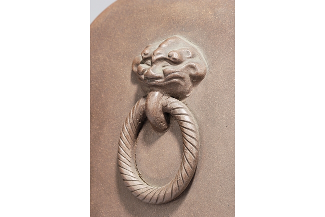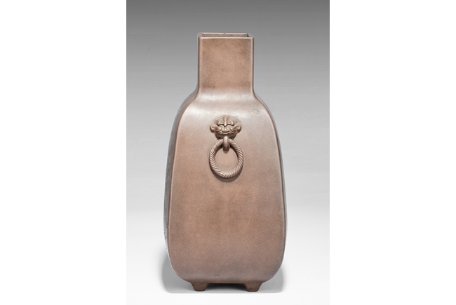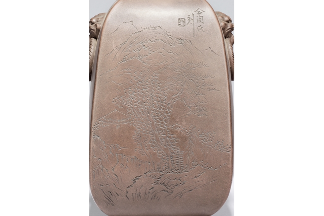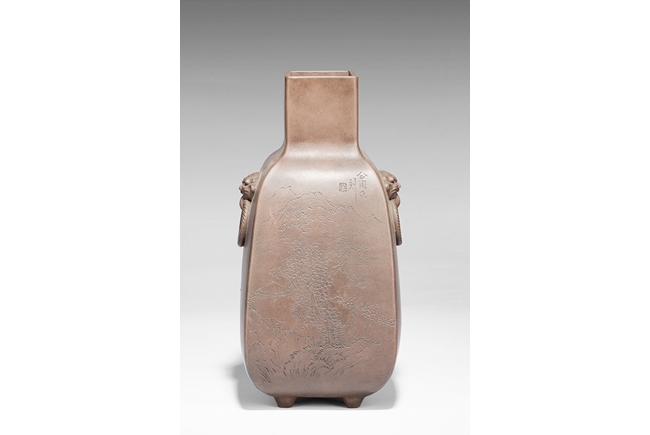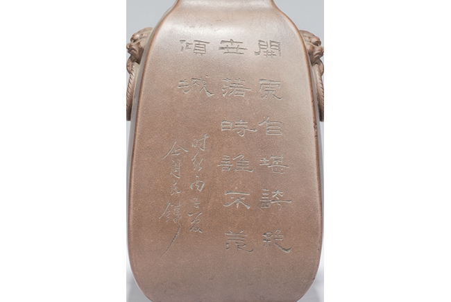 此瓶斂口,四足,雙獸耳叼環,一邊刻有詩文,一邊刻畫有“山中有人家”,刻款 “佰仙監製”。