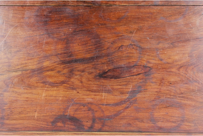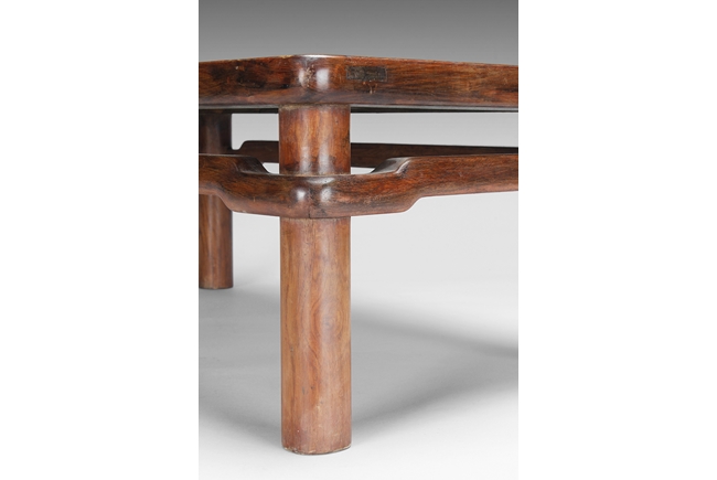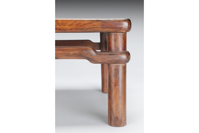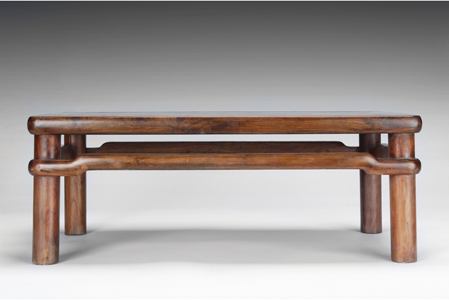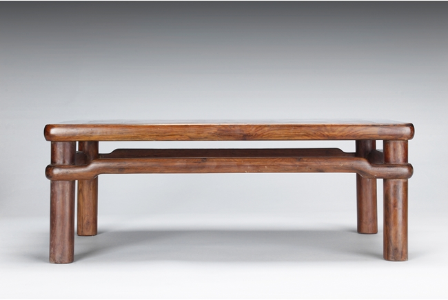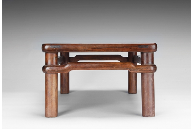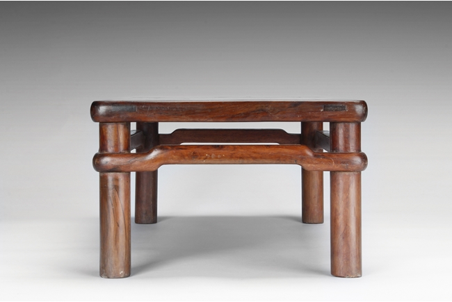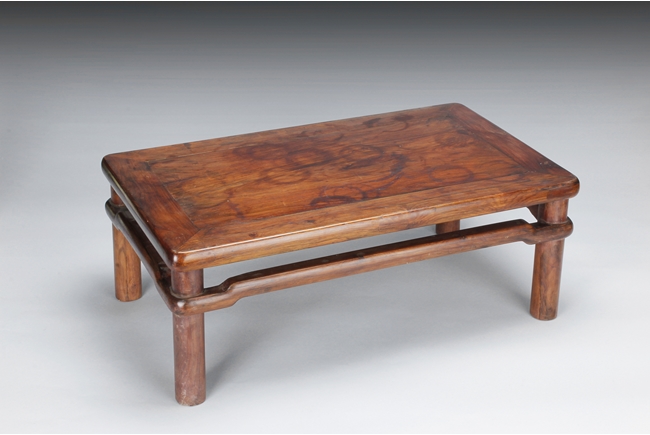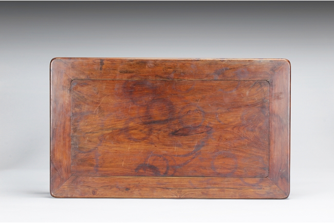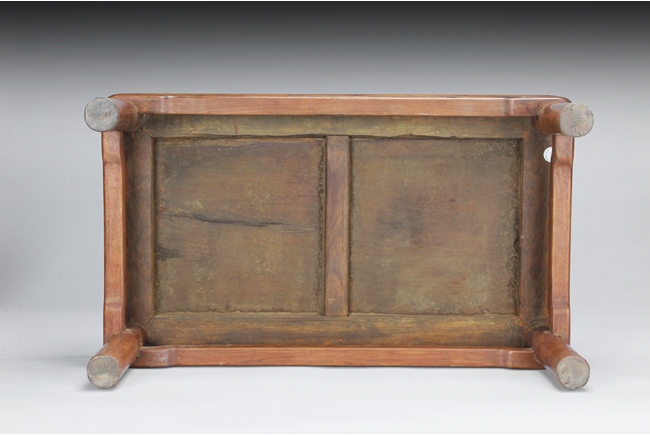 The rectangular paneled top raised on a narrow waisted section, supported on columnar legs, with humpback stretchers on all four sides. The wood with natural color, and grains, with some aged light burn marks from hot dishes on top surface of the table. 19th century