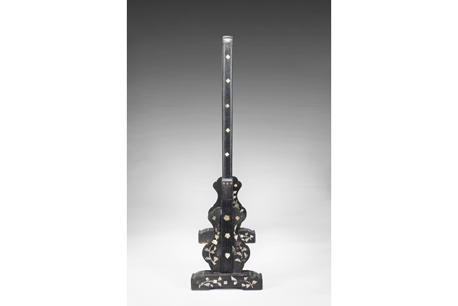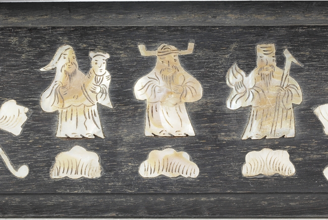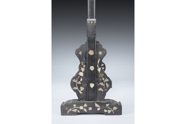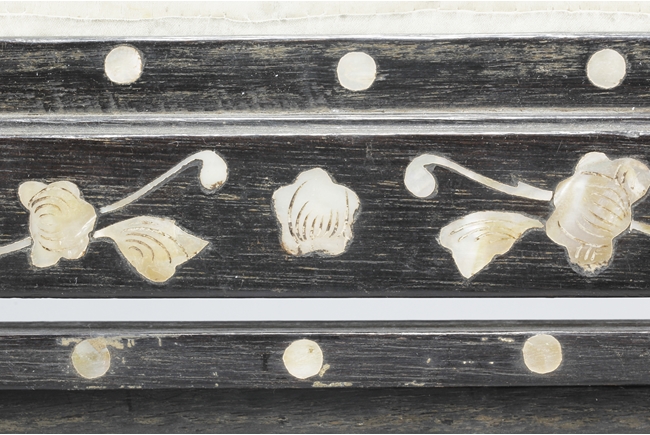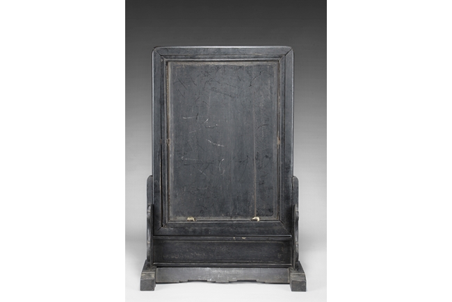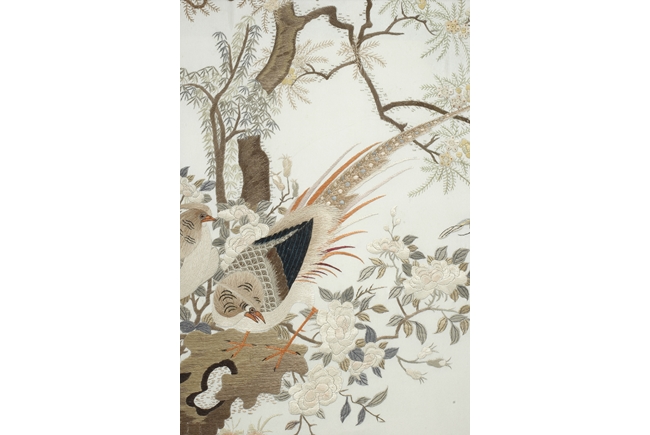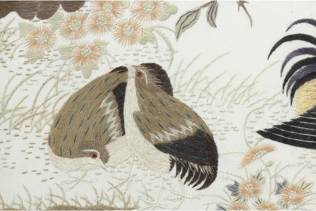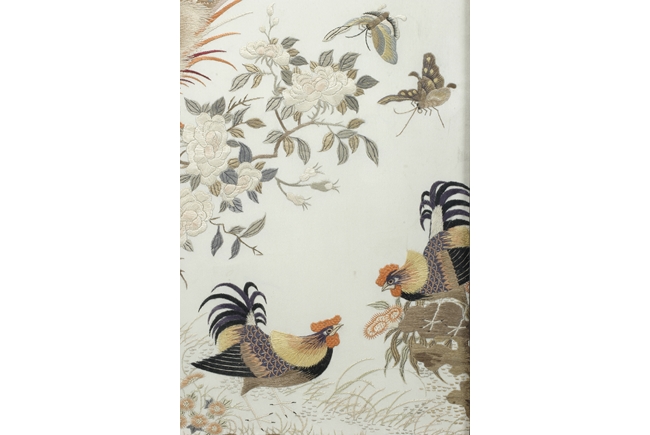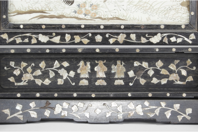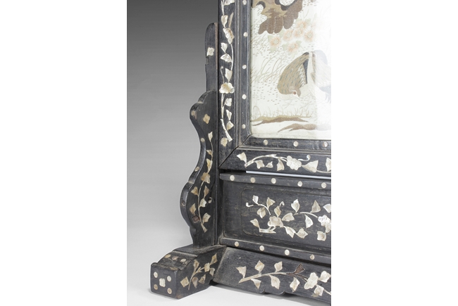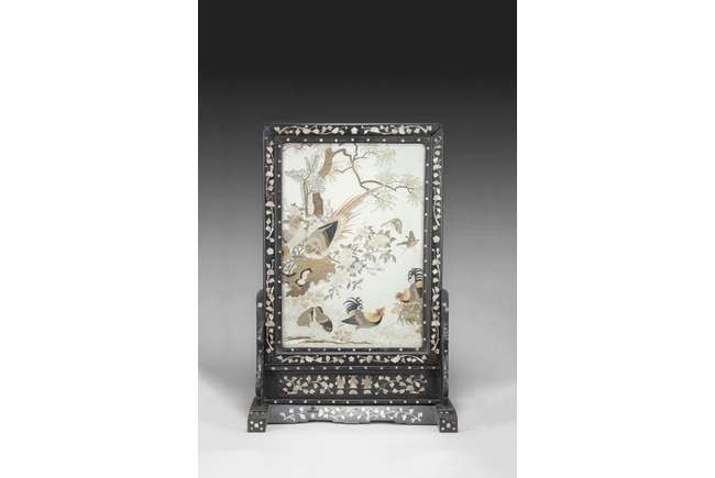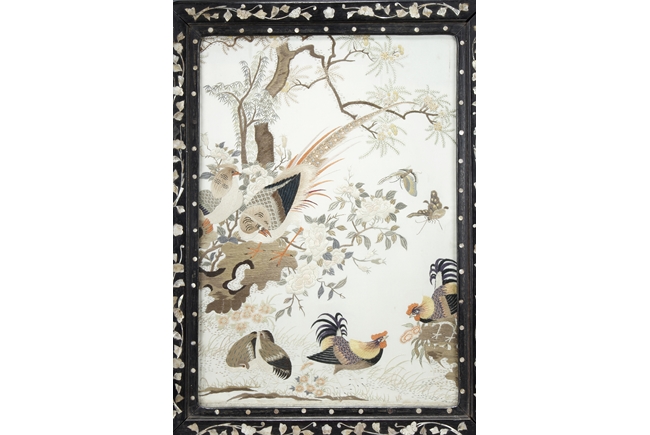 The table screen made of hard wood, inset with mother of pearl to depict flowers, vines, and the Fu, Lu, Shou Stars, with the silk embroidery framed in the center panel, depicting roosters, hens, and pheasants in the wild, with blossoming flowers around them. Age related imperfections such as missing mother of pearl pieces, small scratches and cracks. Qing Dynasty period
