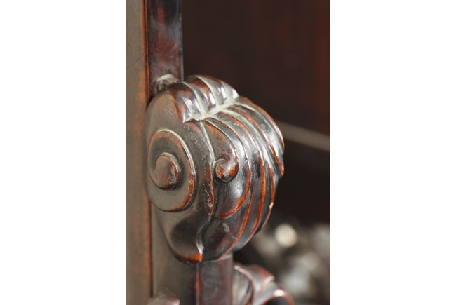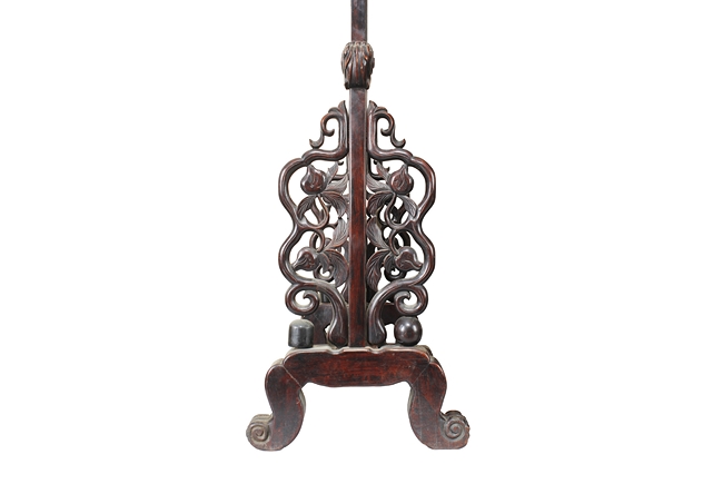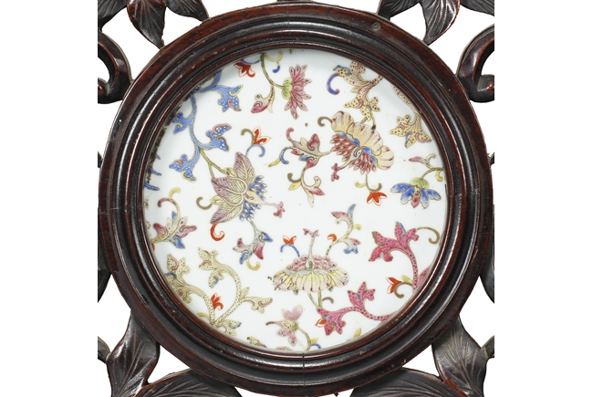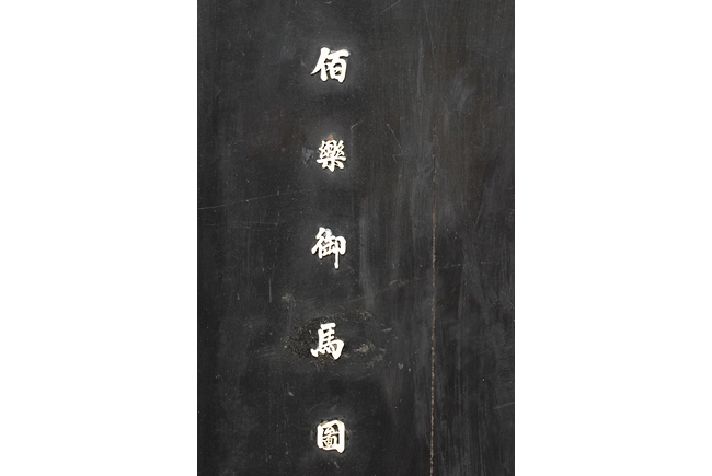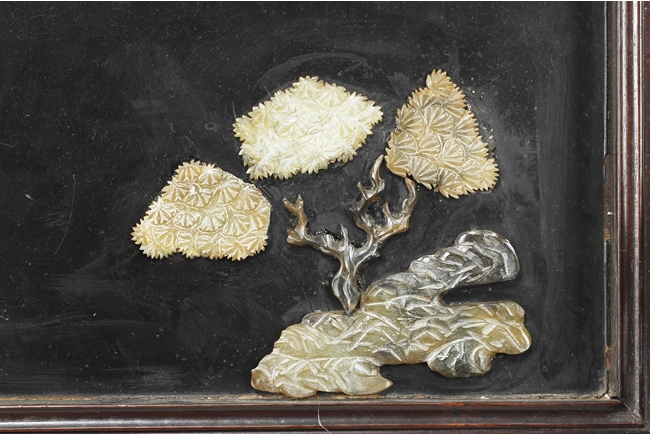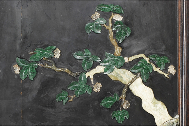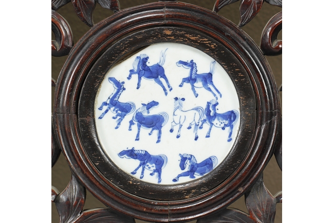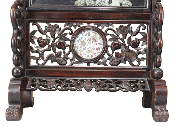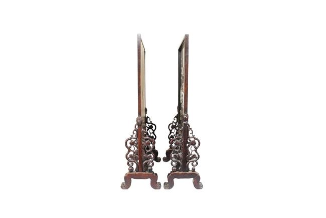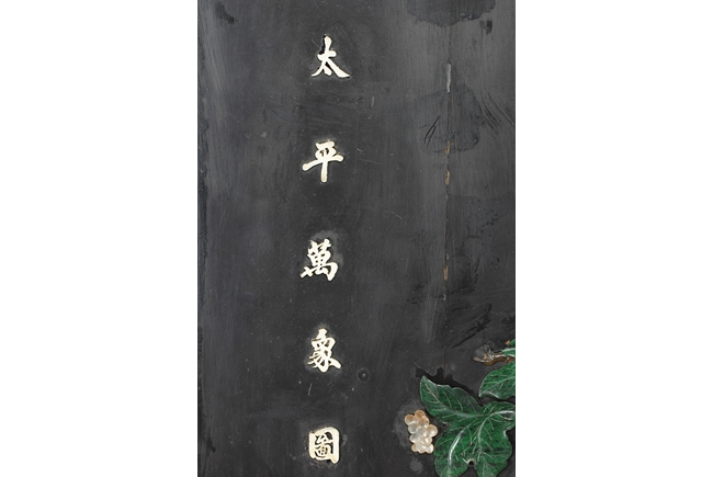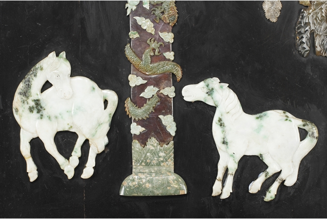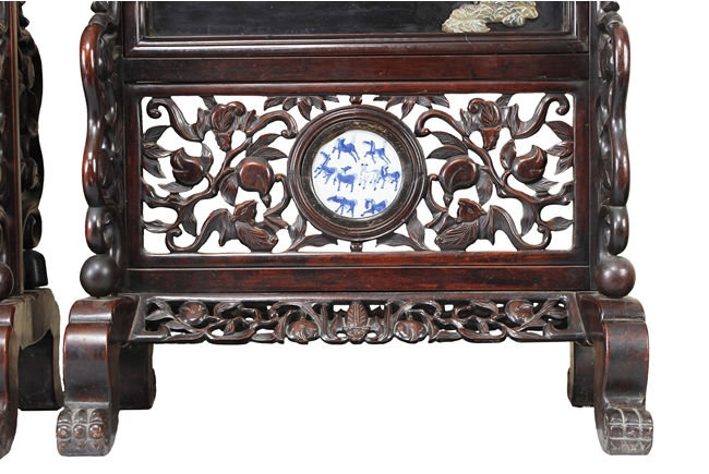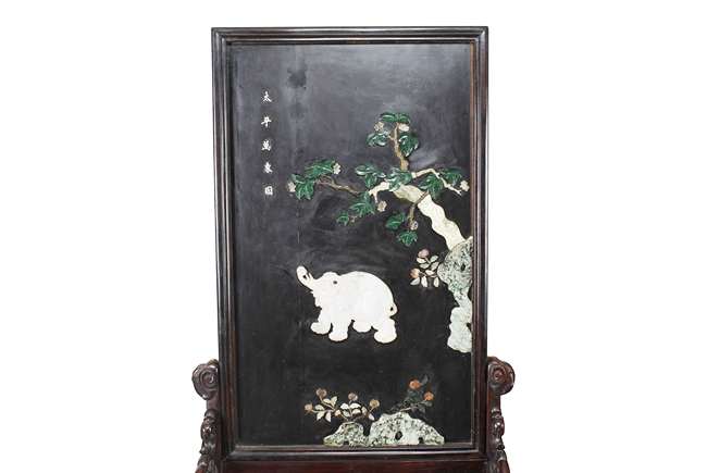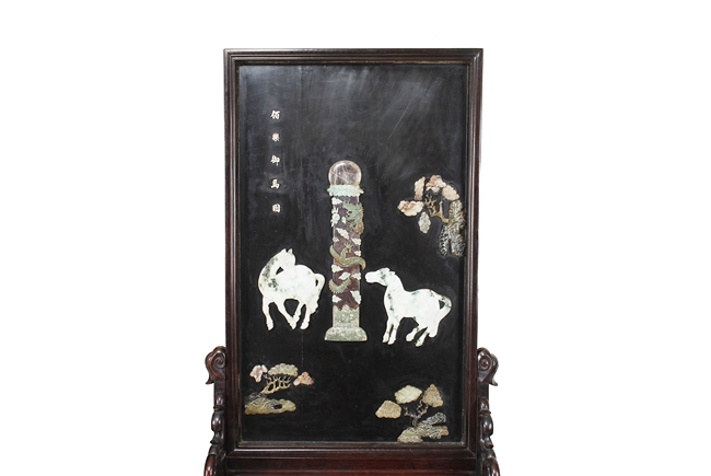 The rectangular lacquer plaque is inlaid with jade-stone, agate, ivory, and jasper, composing an elephant in trees and rock-works setting on one screen, and two horses near a Dragon pillar and flowers on the other screen, each with five different Chinese characters as title. The plaques were each inset into an en-suite hardwood stand, supported by hoof feet, the center and skirt pierce carved with intertwining peaches, leaves, and branches, with a porcelain round plaque in the middle, one depicting flowers and other depicting eight horses. Qing Dynasty period