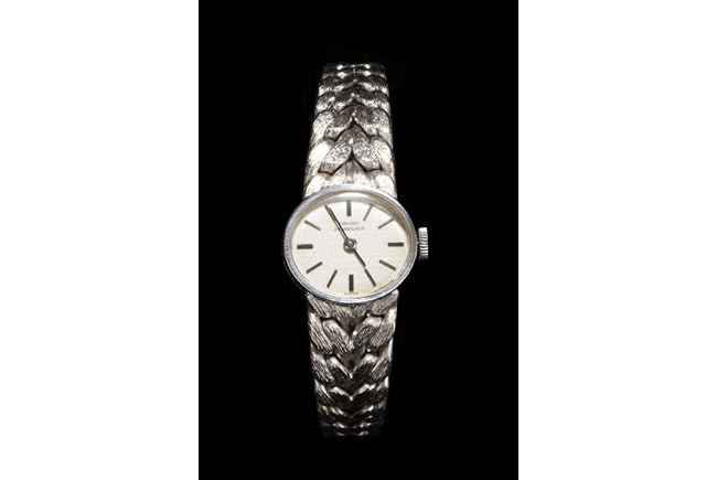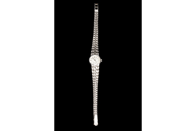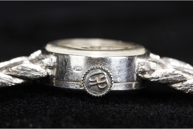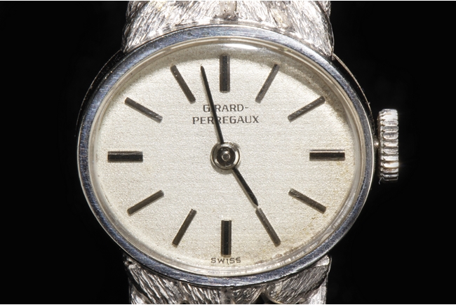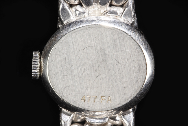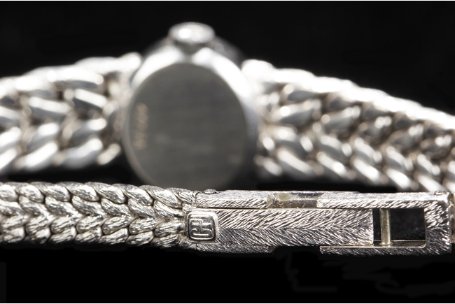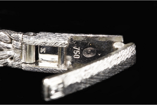 The Gerard Perregaux lady’s watch features watch band and watch frame made from 18k white gold, with the brand’s initial GP mark on the opposite side of the watches turning knob, GP 750 mark on the back of the watches clipping, serial number 477 FA on the back side of the watch.