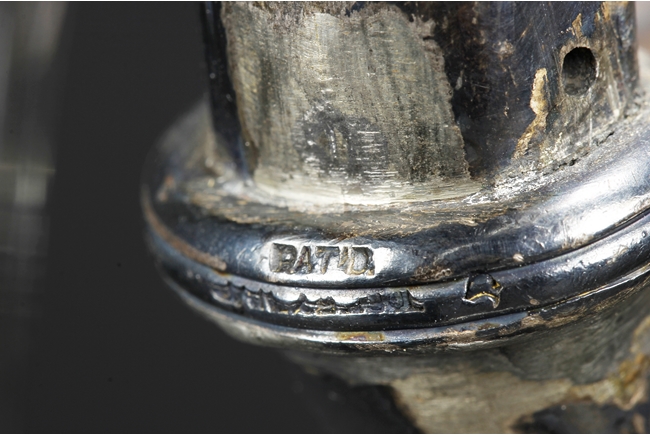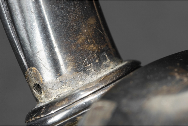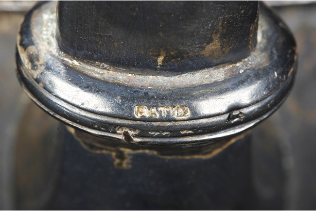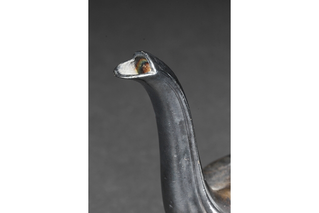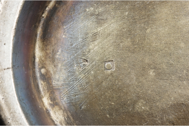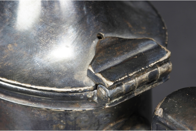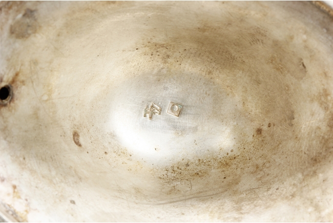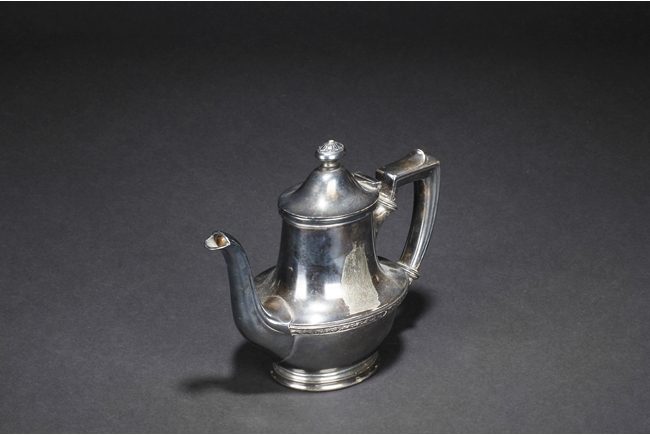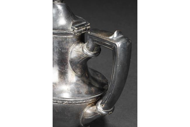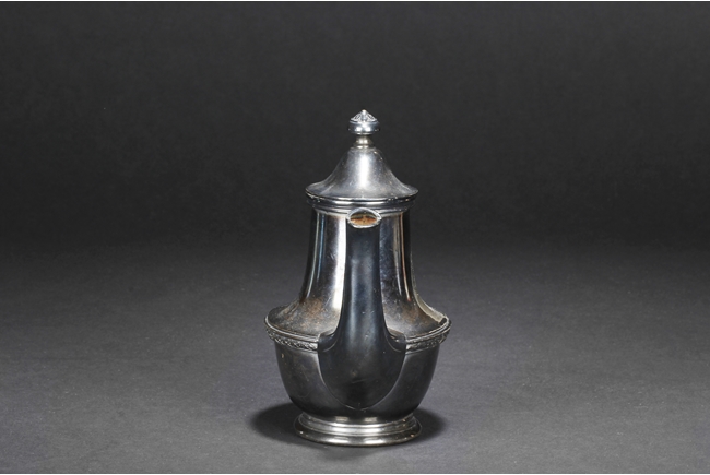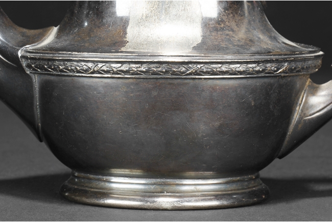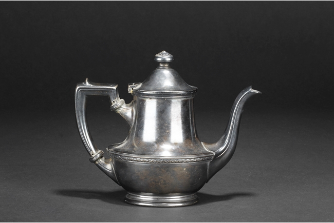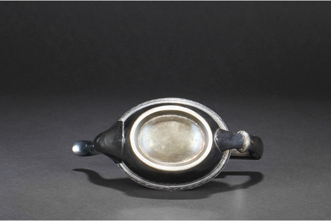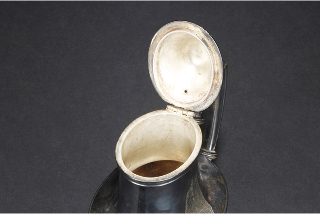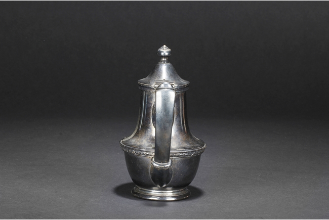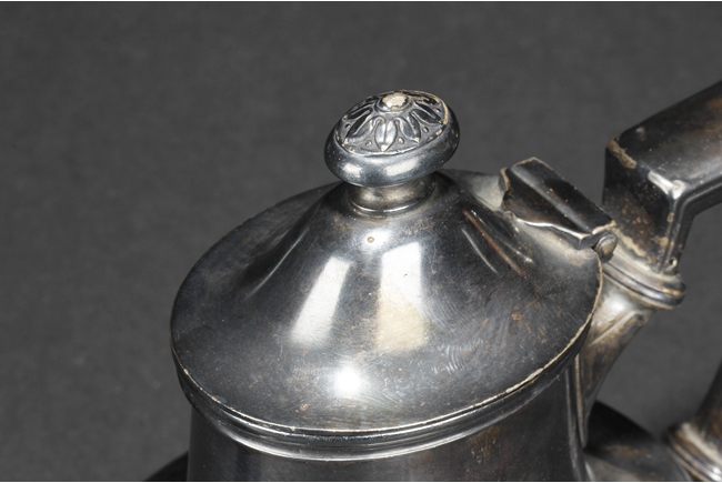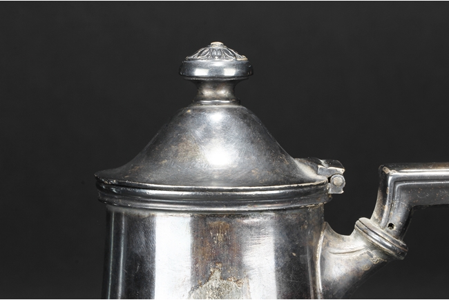 Tapering cylindrical and on spreading foot, the waist with foliage and flower scrolls, the spout and handle with stylized line on the side, the finial of oval form with leaves on top. Late 18th century or early 19th century