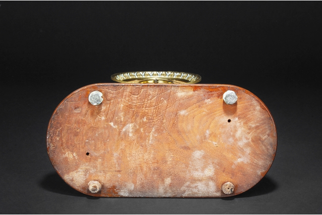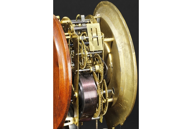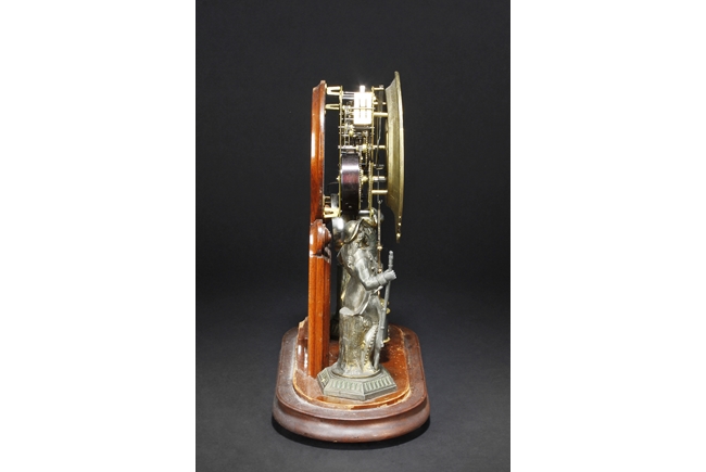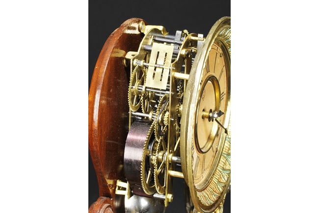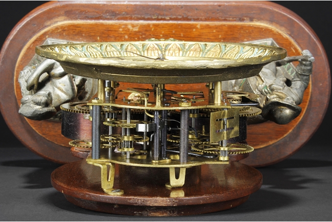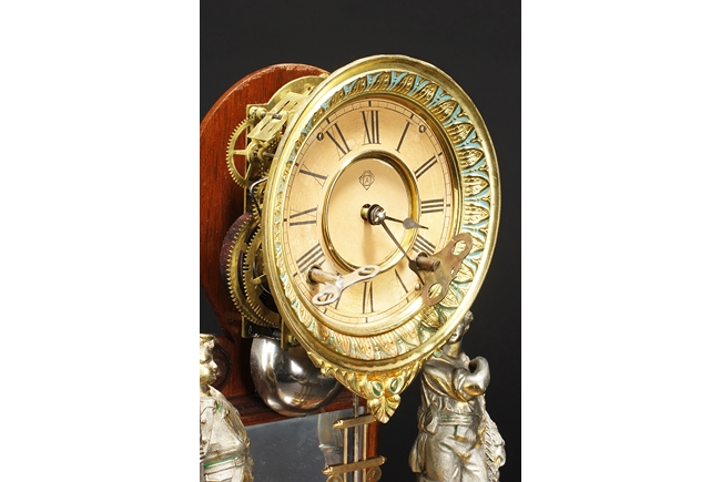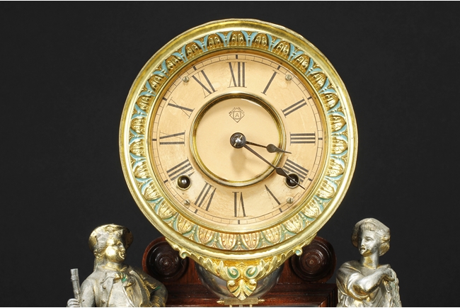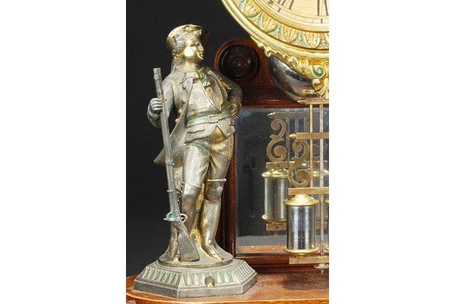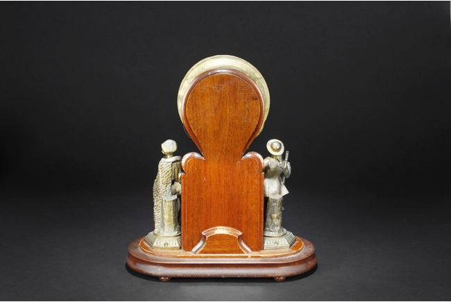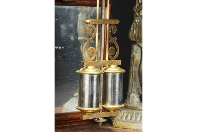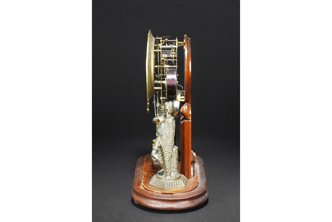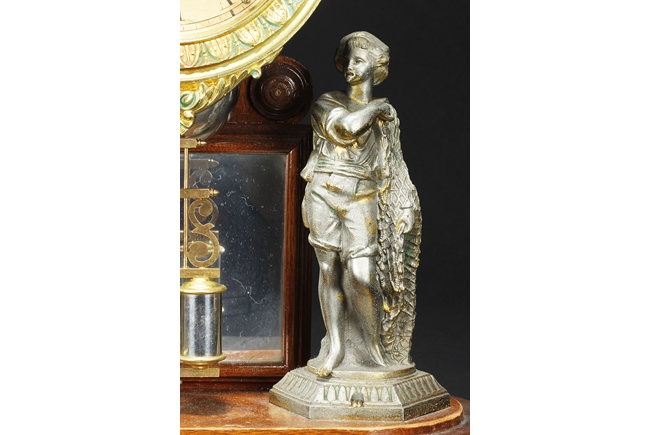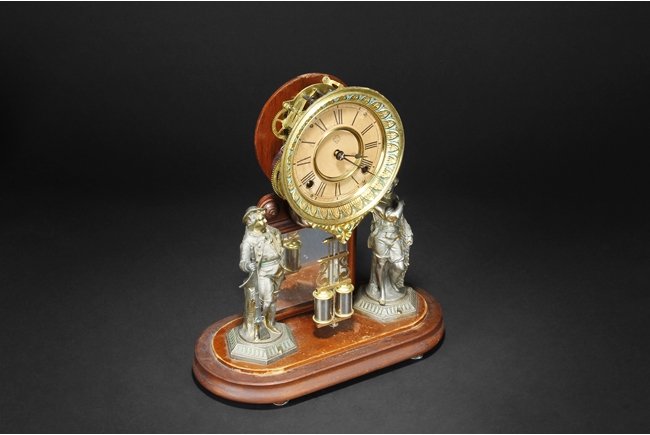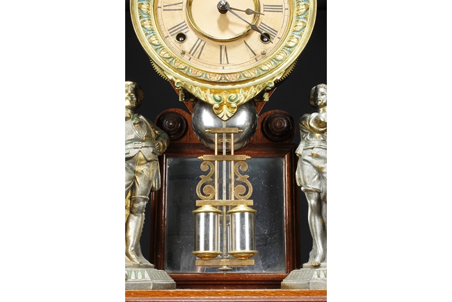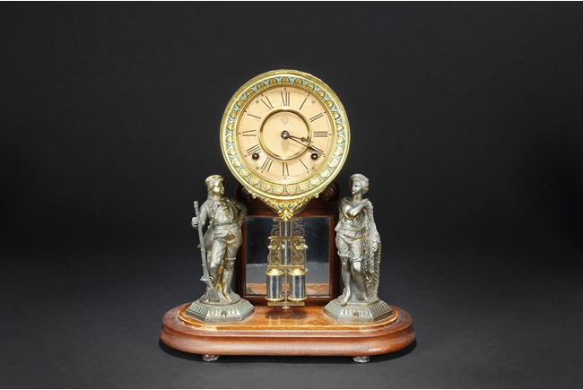 The winding clock with a balanced weight situated on top of a mirror enclosed in wood frame, with a cast figure of male hunter and female fisherman on each side, all situated on an ovoid stand. The winding mechanisms are uncovered and can be seen easily from the side. Winding key included. 19th century
