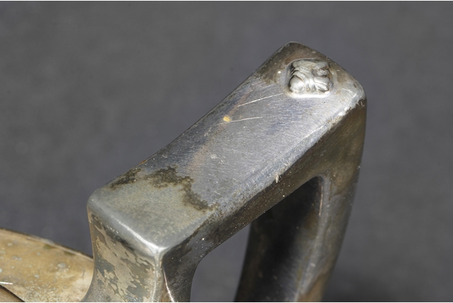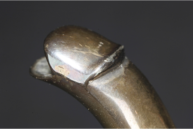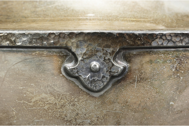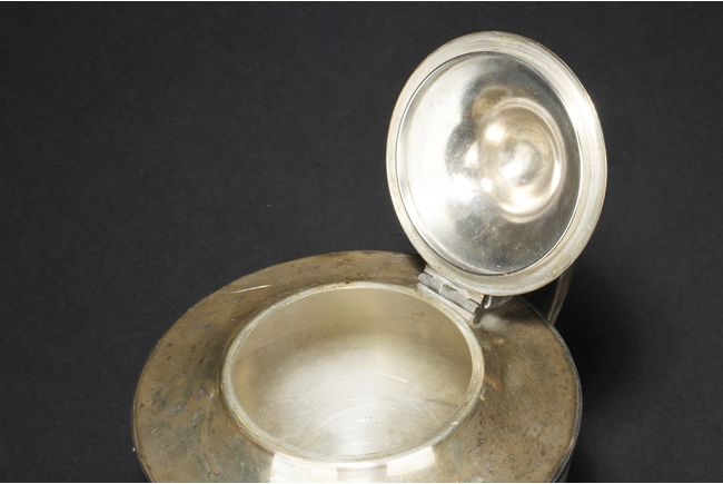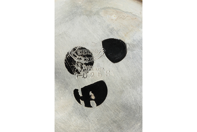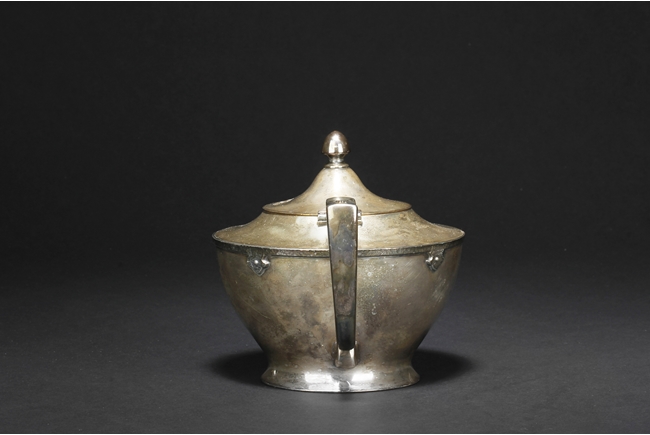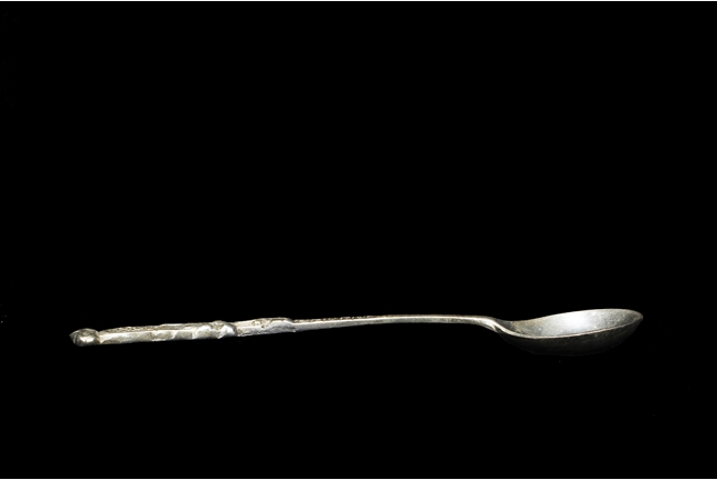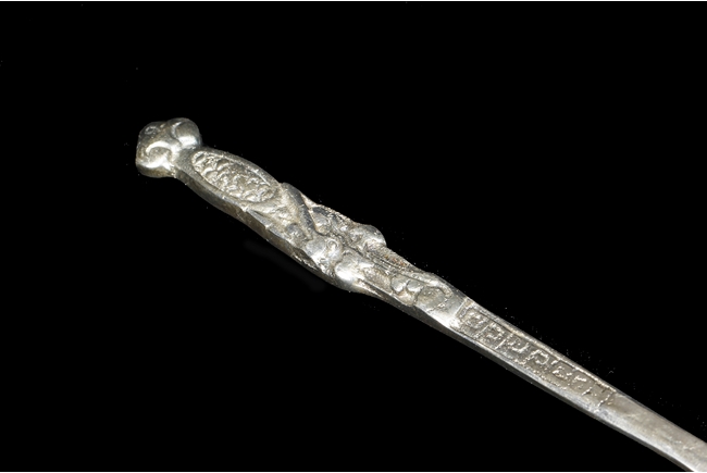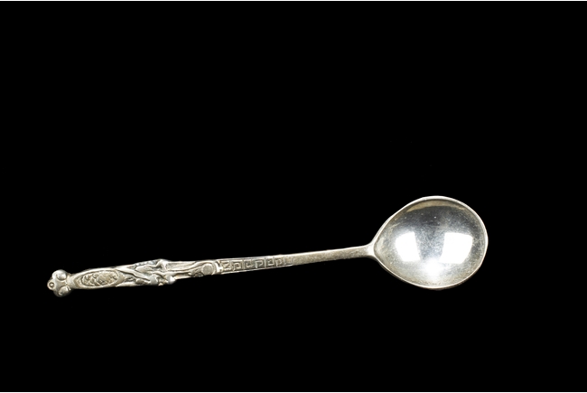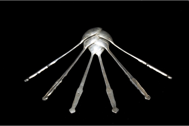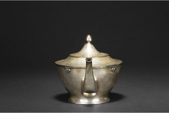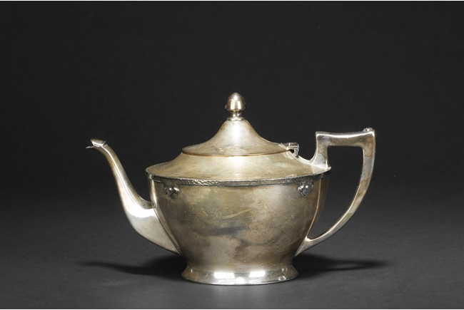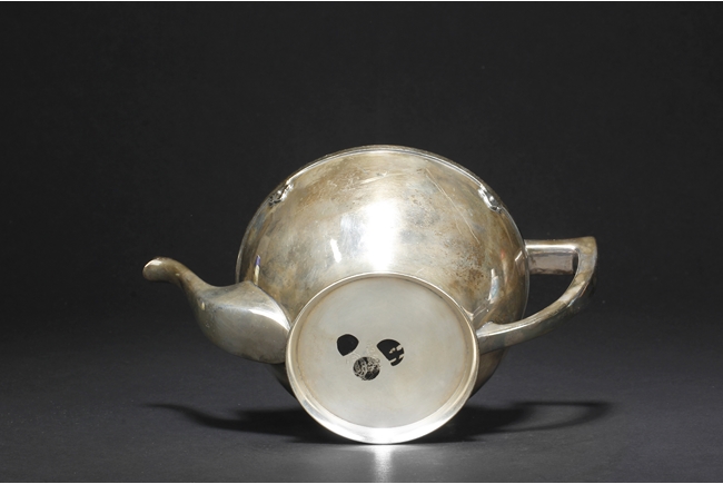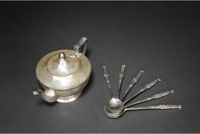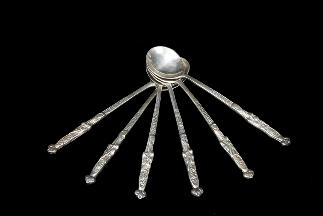 The silver teapot with tapering cylindrical form, the bottom with “Superior S. P. Co.” mark, with catalog number 7025S. The six long silver spoons of equal size and design, with scale and key-fret patterns on the handle. 19th century