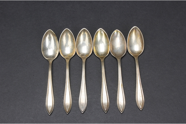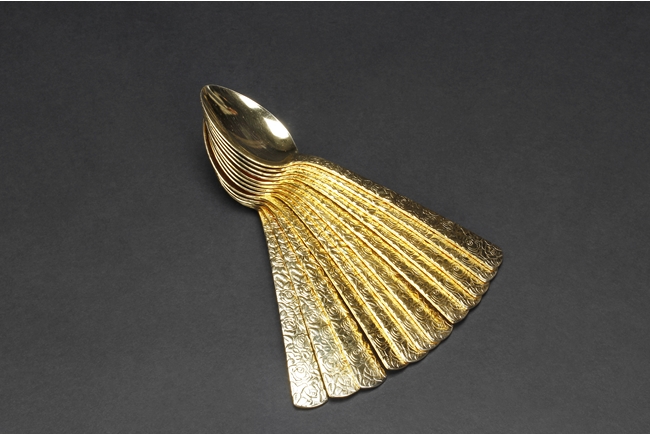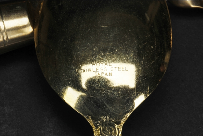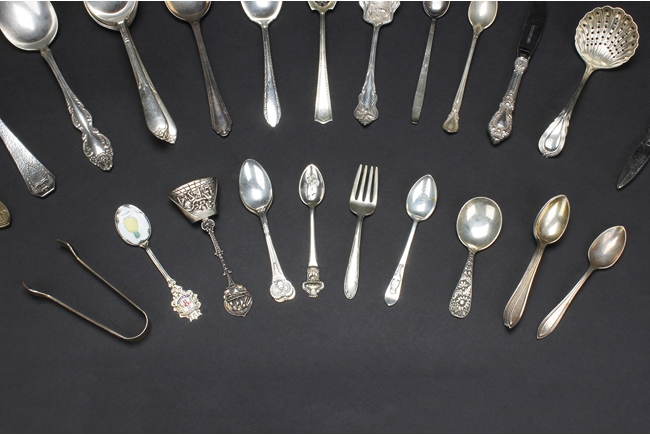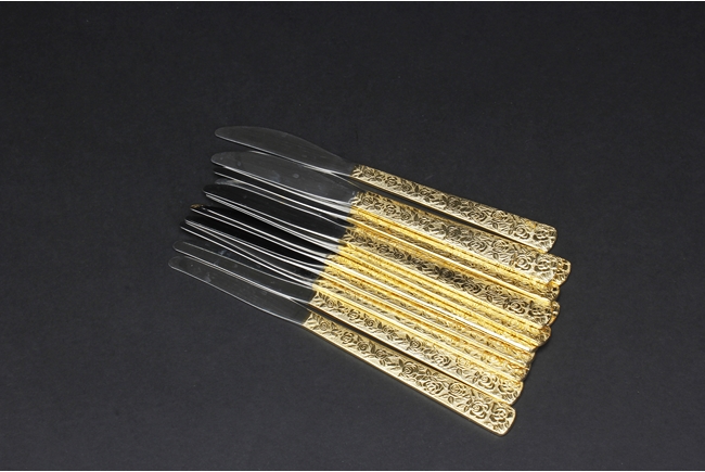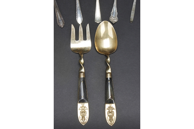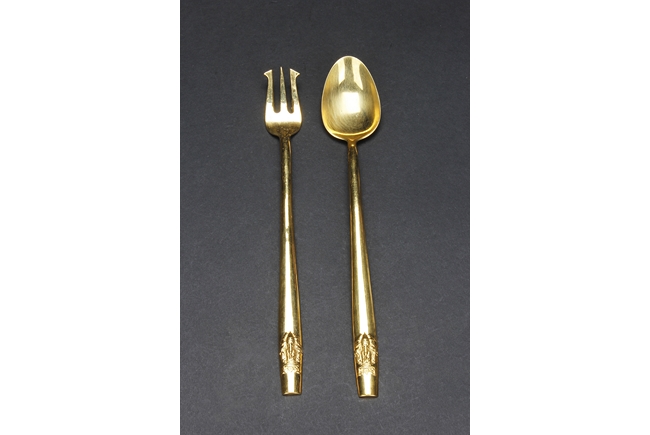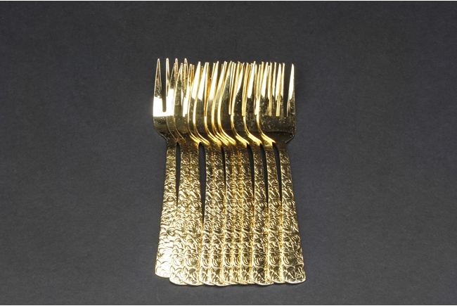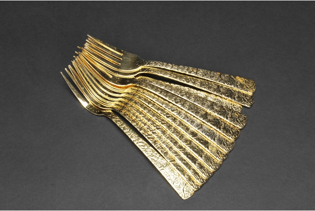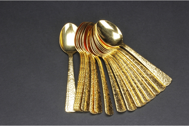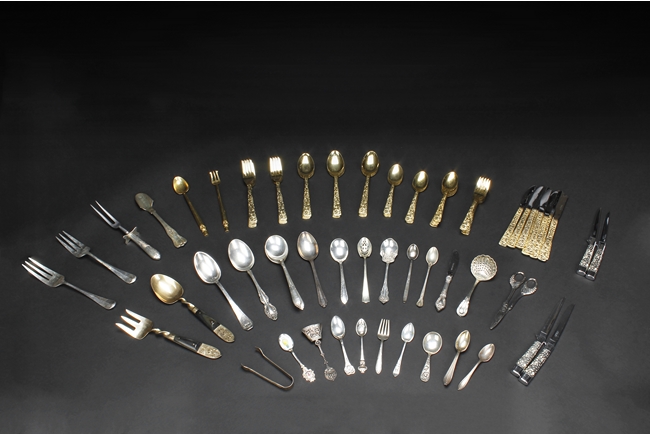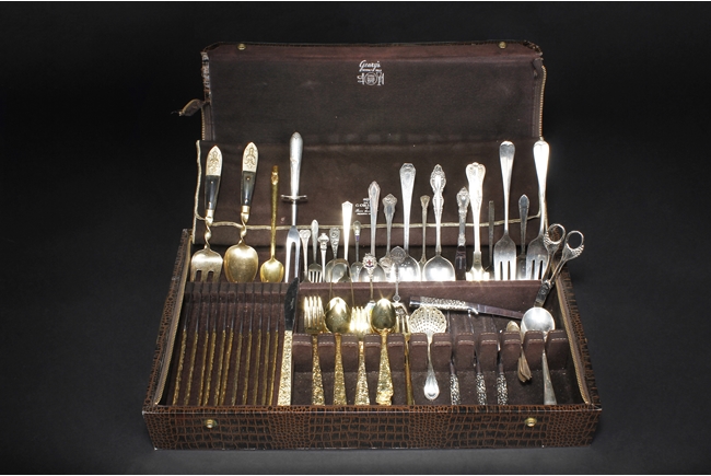 The group includes multiple sets of gold plated and silver utensils, such as forks, knives, spoons, and others. Includes a holding box.