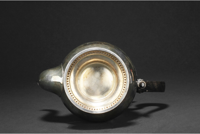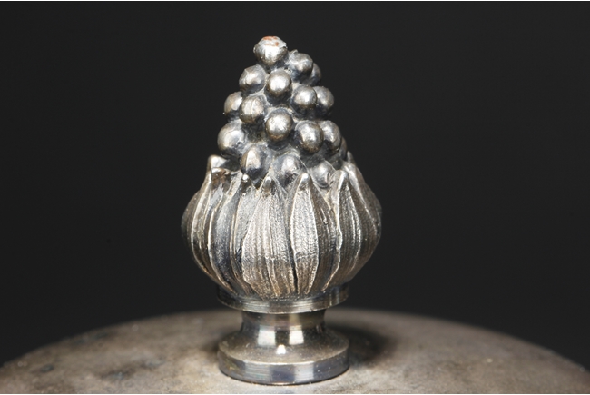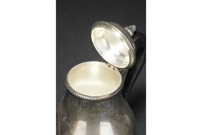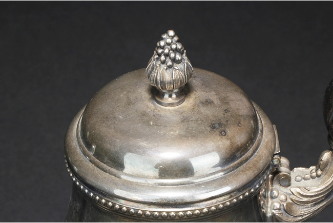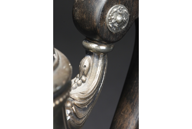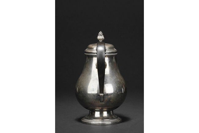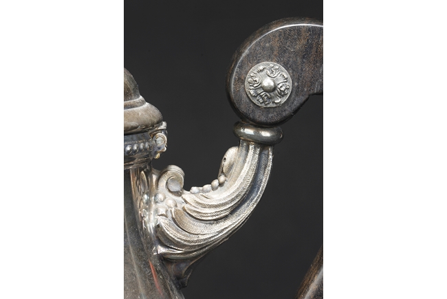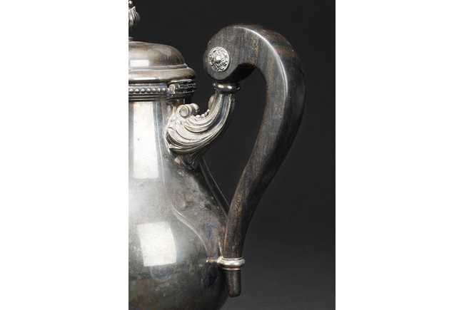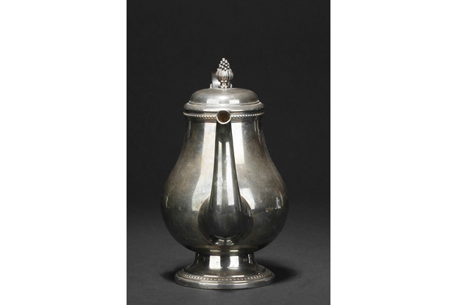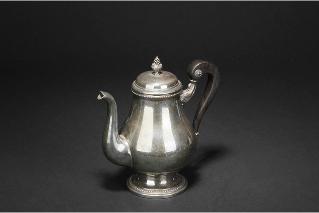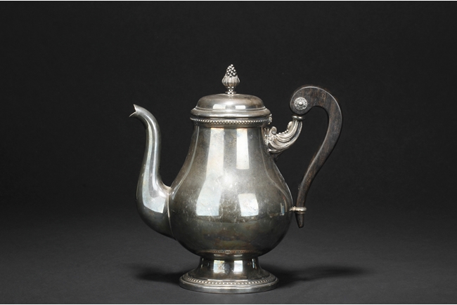 Of baluster form, the silver teapot with wooden handle, extending to leafy sprouts connected to the neck, the rim and base with scrolling pointed dots, the finial in the form of rounded fruits covered slightly by leaves. Late 18th or early 19th century