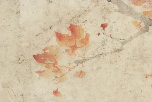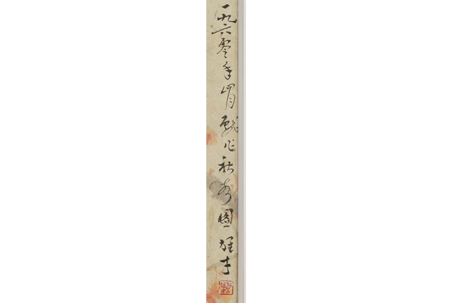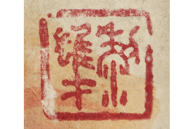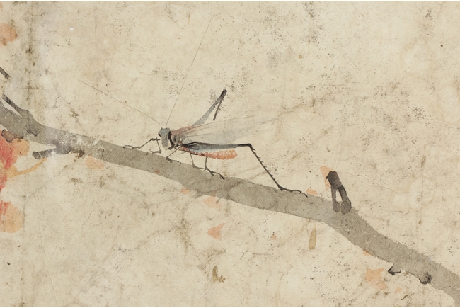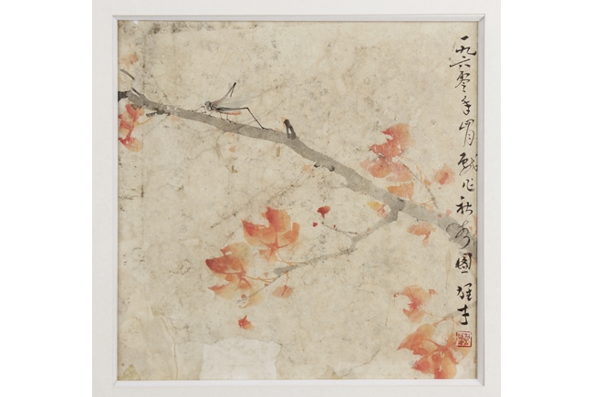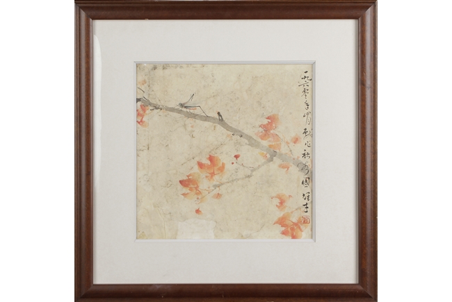 Ink and color on paper, framed. The painting depicts a grasshopper on top of a branch, with orange flowers blossoming around it. Artist signature and mark “Li Xiongcai” on the right side.