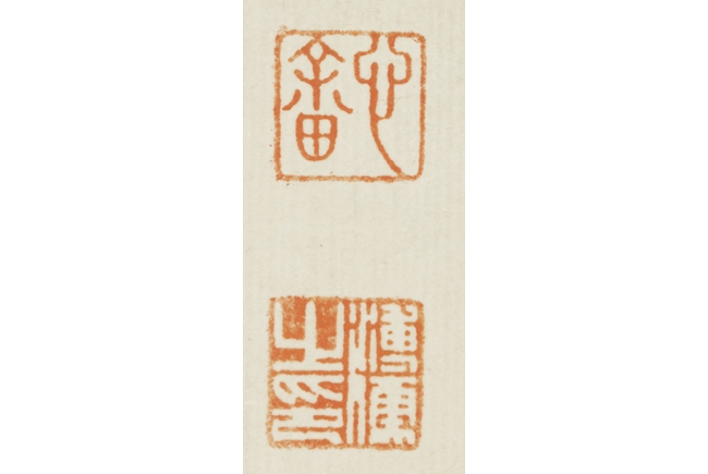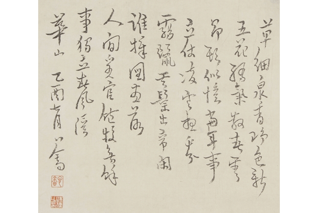 Color and ink on paper, hanging scroll. The painting depicts a man leading a horse crossing the river, with willow tree in the background. Chinese colophon, artist signature and mark “Pu Xinyu” on the top left.