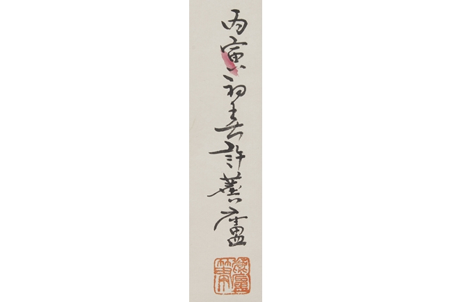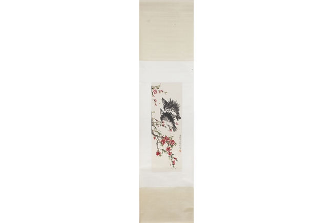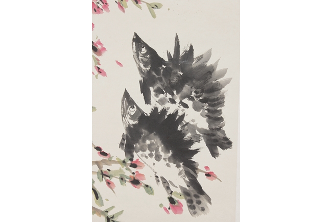 Color and ink on paper, hanging scroll. The painting depicts two fishes swimming up the river against the reflection of blossoming flower tree. Artist signature and mark “Xu Linlu” on the right side.