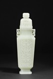 十九世紀 白玉雕海藻紋方形雙耳蓋瓶