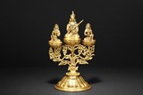 A TIBETAN GILT BRONZE FIGURAL GROUP OF PADMASAMBHAVA AND TWO ATTENDANTS