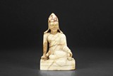A PAINTED MARBLE CARVED SEATED MONK FIGURE