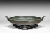 明早期 青銅刻回龍,三足刻人物雙耳盤,底座為清代配紅木