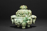 AN IMPORTANT AND RARE JADEITE CARVED TRIPOD CENSER WITH COVER