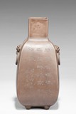 QI TAOSHI: A ZISHA STONEWARE RECTANGULAR VASE WITH BEAST MASK HANDLES