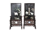 清 红木雕大插屏一對,繪太平萬象圖,伯樂禦馬圖,嵌玉石,瑪瑙,碧玉,象牙