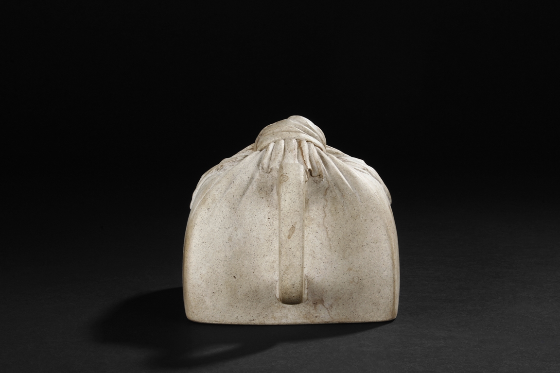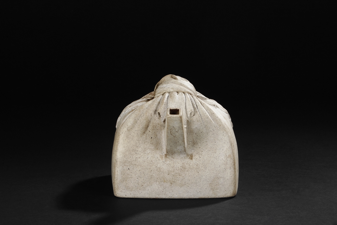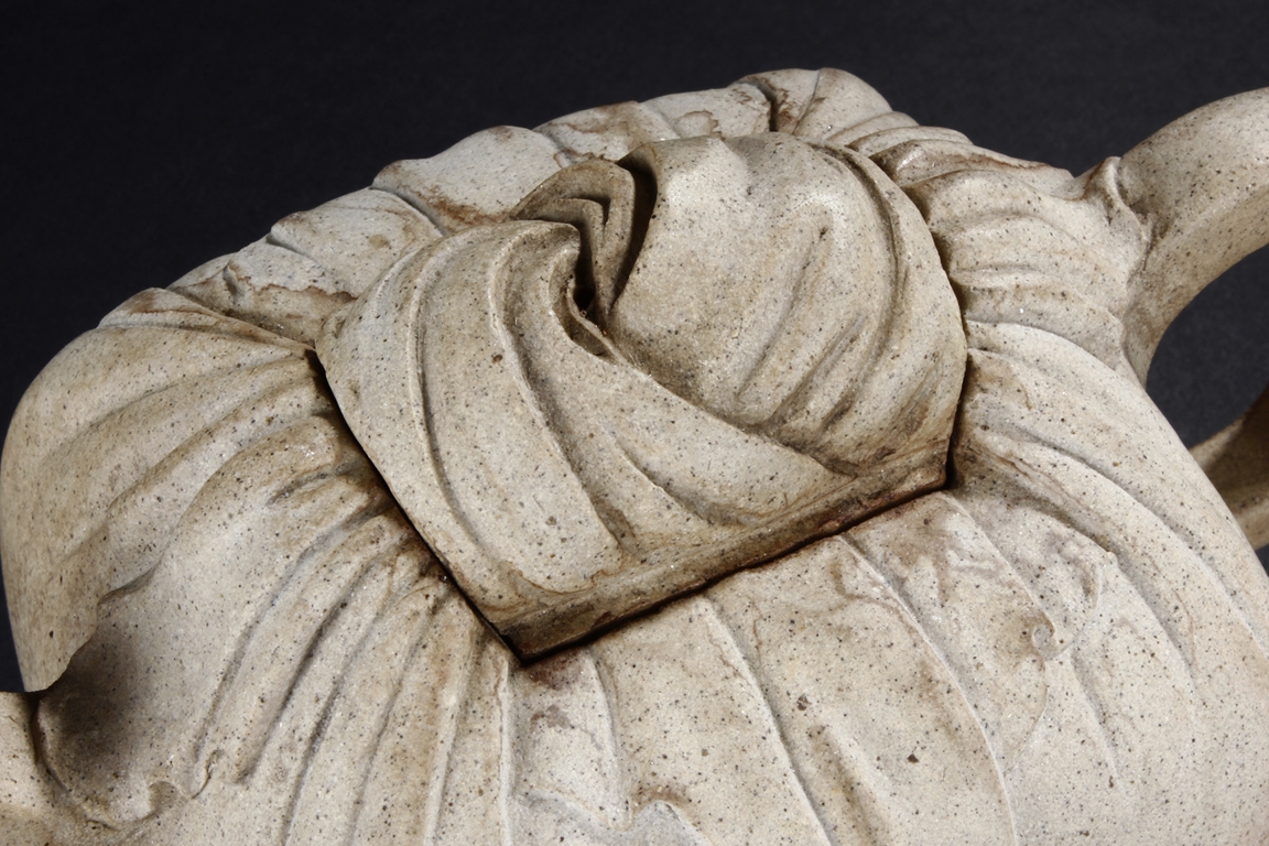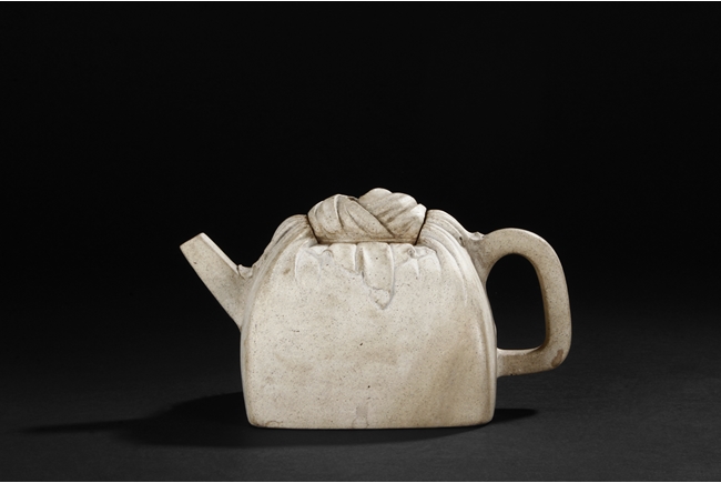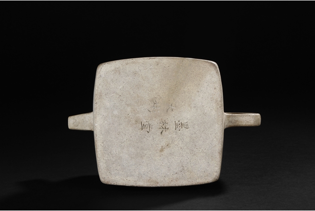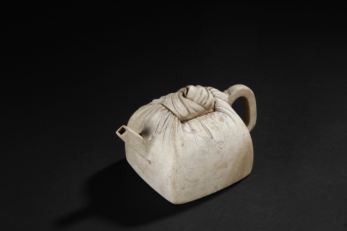 Of expanding square form in shape of a cloth wrapped large stamp seal, the teapot made from Duan clay with thin grains of sand, the spout rising diagonally upwards with square opening, the handle in flattened ear form, the lid and finial with wrapping knot design, and the bottom bears signature of "Da Bin" and "Molin Tang". Molin Tang was a store owned by Xiang Zijing, of the same period as Shi Dabin. Signs of repair on the bottom and body of the teapot. Late Ming Dynasty period or early Qing Dynasty period. Xiang Yuanbian (1525-1590), courtesy name Zi Jin, has many art names, such as Molin, Molin Shanren, Molin Jushi, Xiangyan Jushi, Tuimian Zhuren, Huiquan Shanqiao, Molin Nensou, Yuanyang Huzhang, and Qiyuan Aoli. He was born in Jiaxing city of Zhejiang province, and was a famous collector during the Ming Dynasty period.
