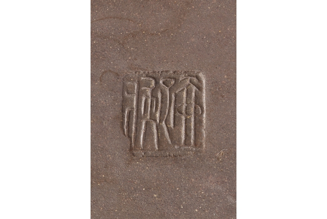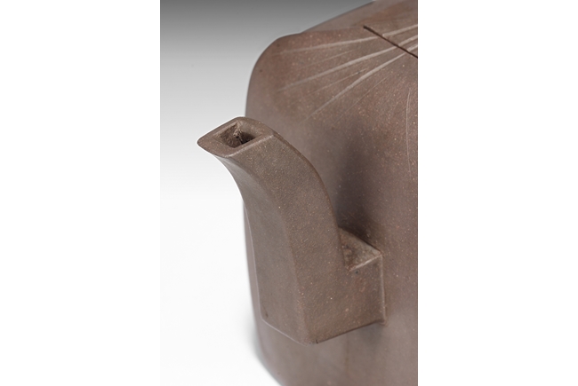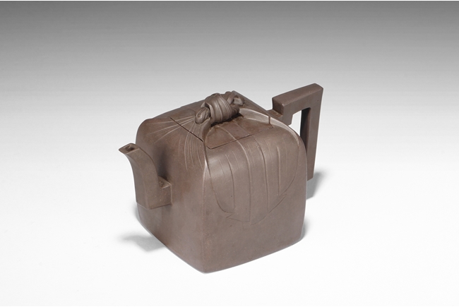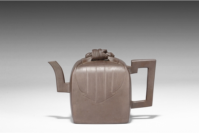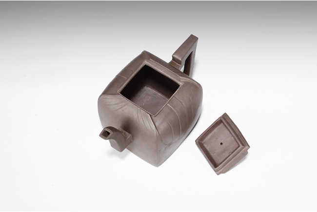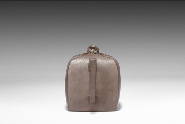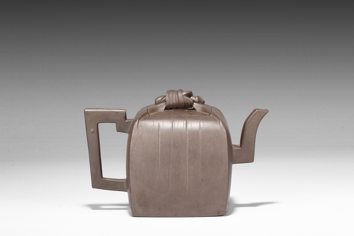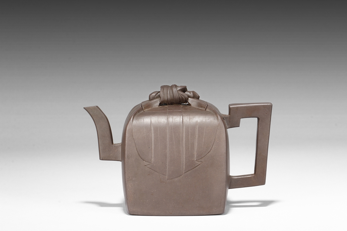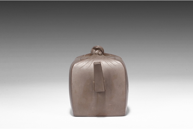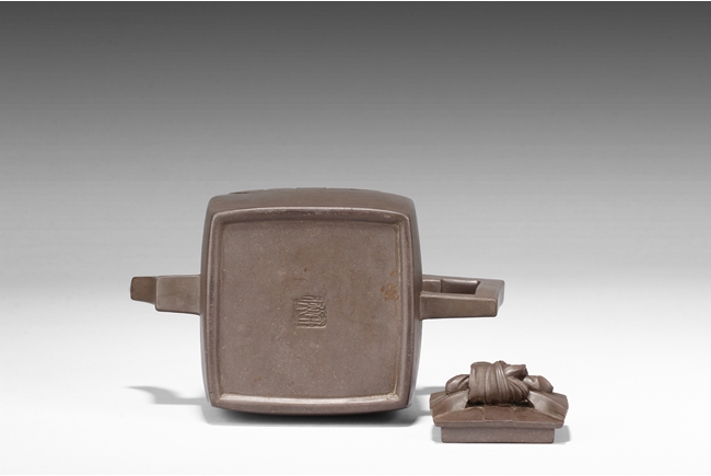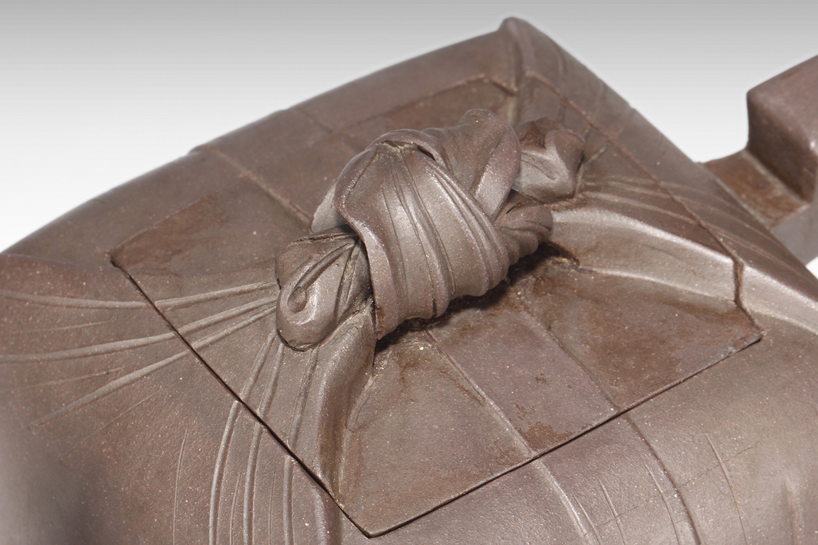 Of curved rectangular form, the teapot depicts a cloth wrapped large stamp seal, the finial depicts the cloth knot, with cloth strands on the teapot body, the spout and handle in sharp rectangular form, the bottom with two character "Hu Chi" mark. Hu Chi was a renowned teapot maker during the mid Qing Dynasty period, and this teapot is one of his signature art work.