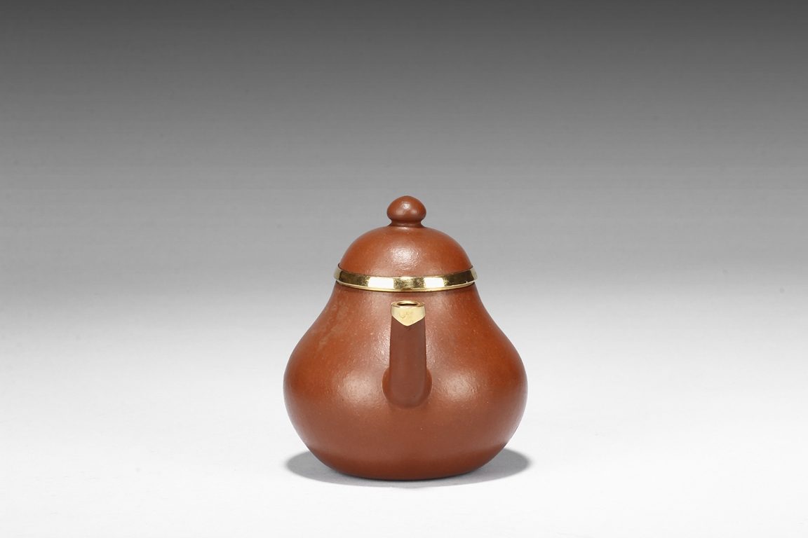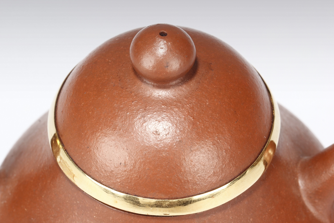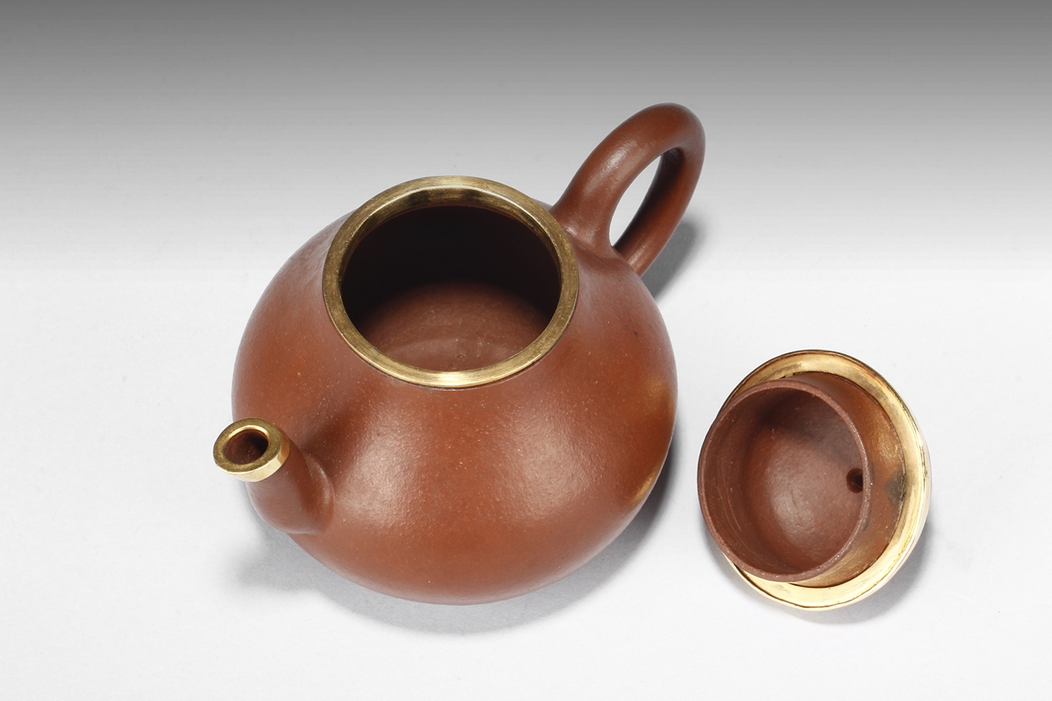 Of traditional pear form, the teapot exhibits signs of export product, such as the bronze encased lid edge, rim, and spout tip, the color of reddish-brown. Two character mark "Si Ting" below the handle.