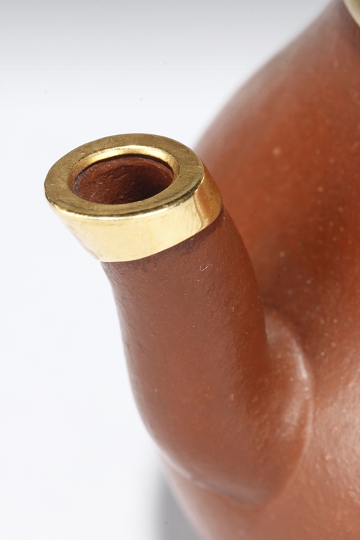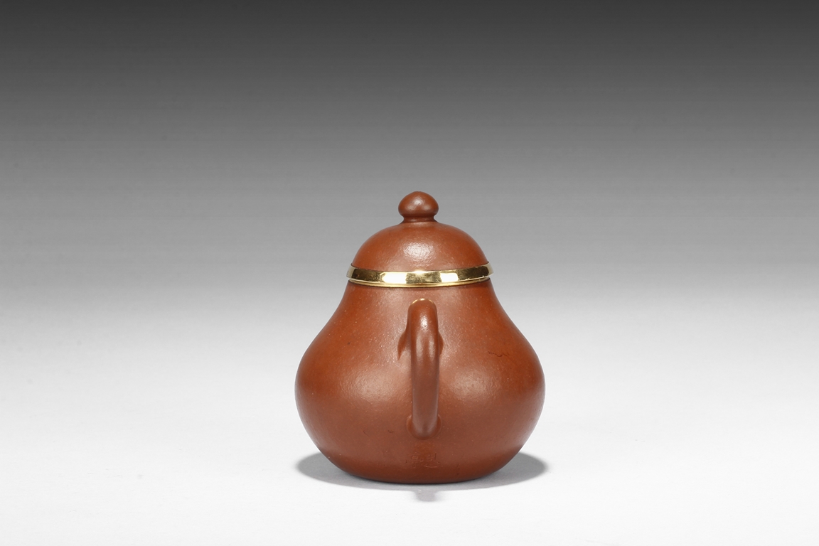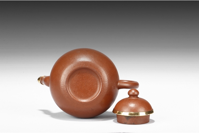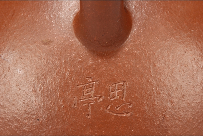 此壺為經典梨形式壺,有外銷壺的特色,壺咀蓋沿保留著原配的包銅,壺把下思亭刻款。陸思亭,清初製陶人,生卒不詳,在朱泥壺中,孟臣,逸公,君德,思亭等,以上均為清代制壺高手,也正因他們名聲,大多人先後為後人所借名,并成為宜興朱泥小壺的代名詞,其中尤其以君德,思亭更為特定式樣的代名。