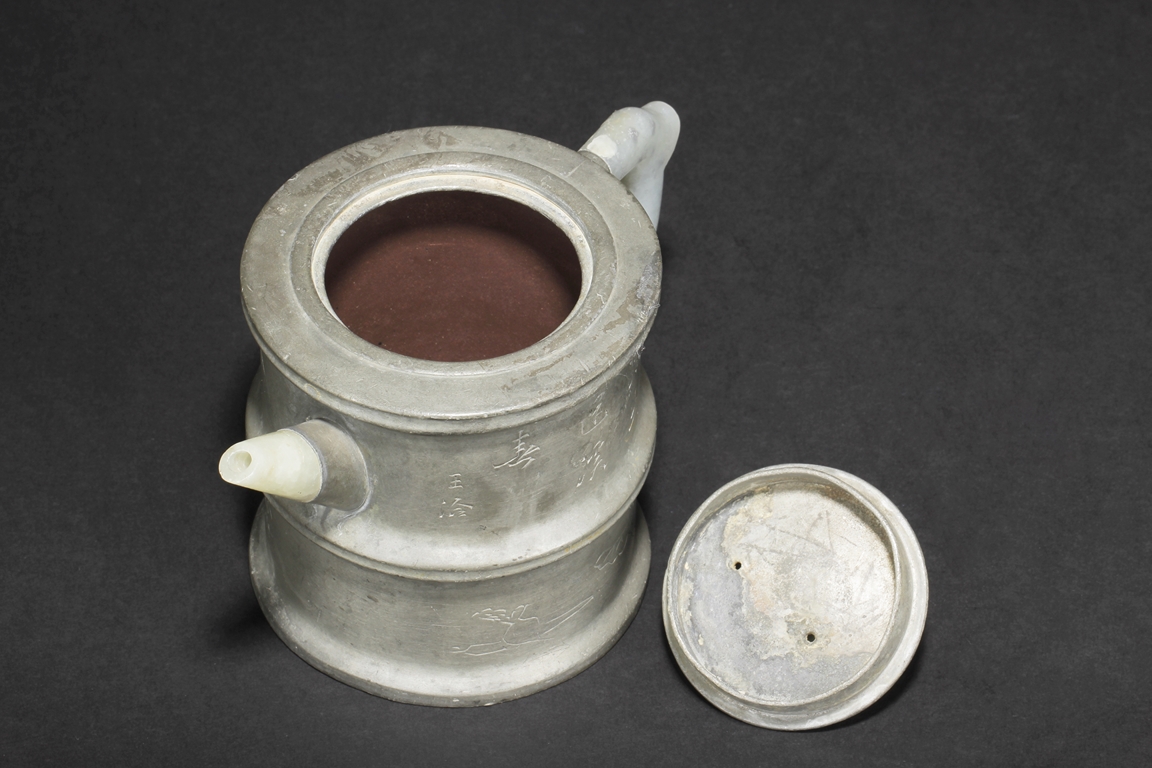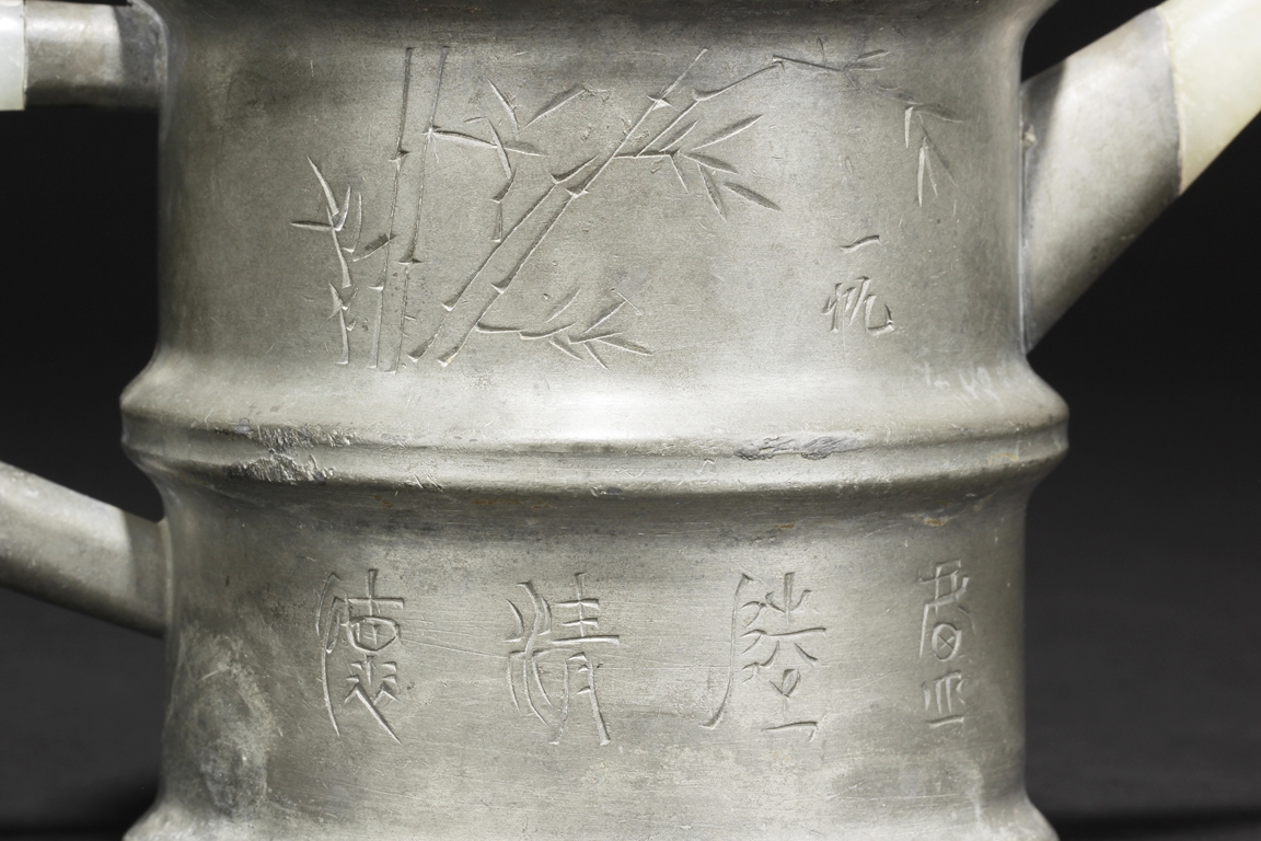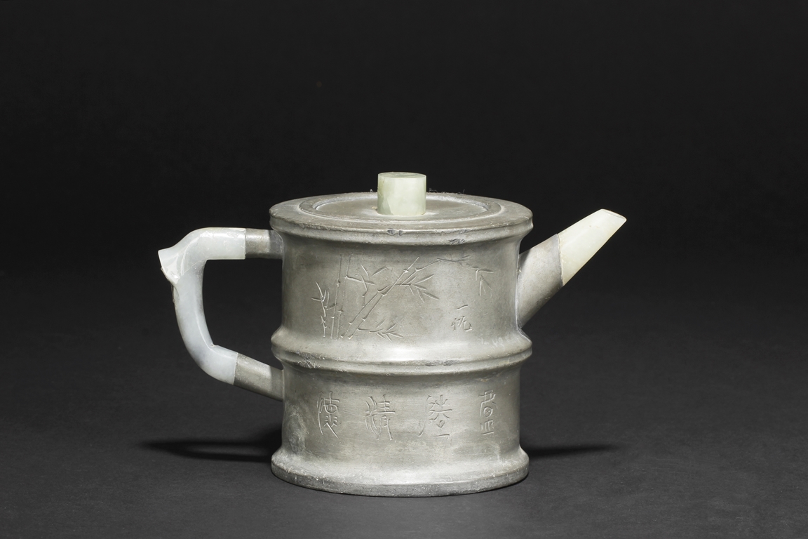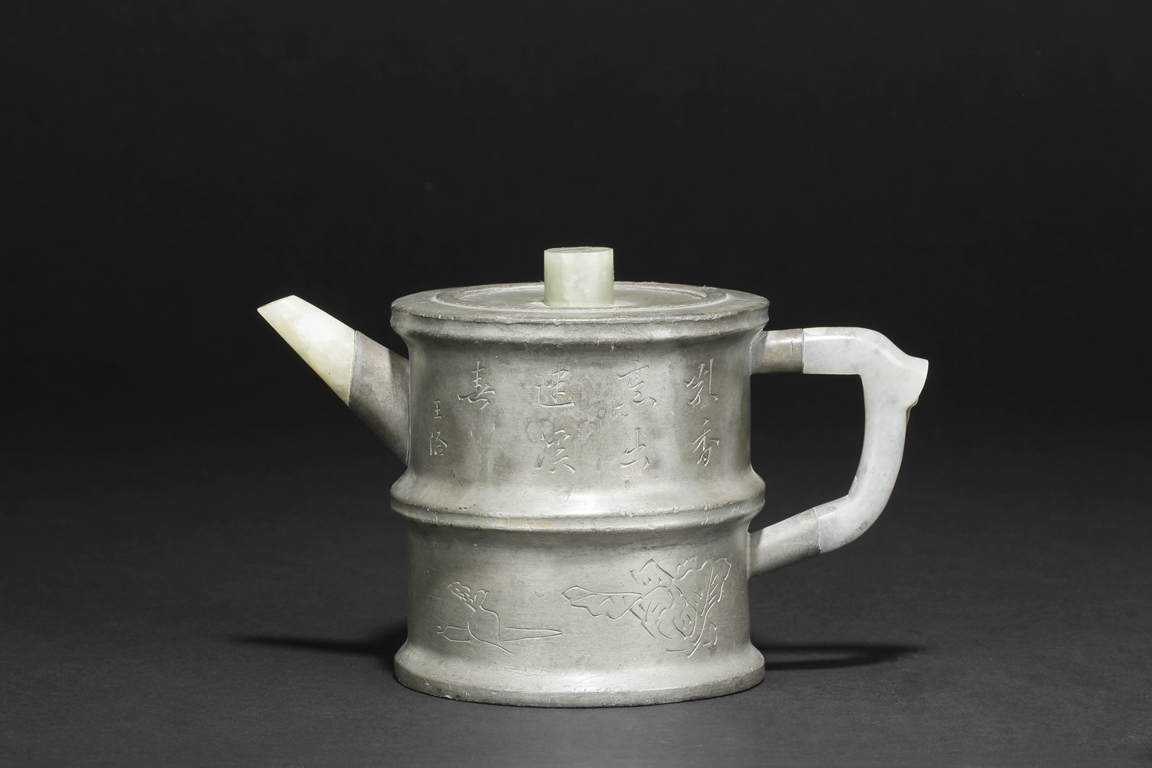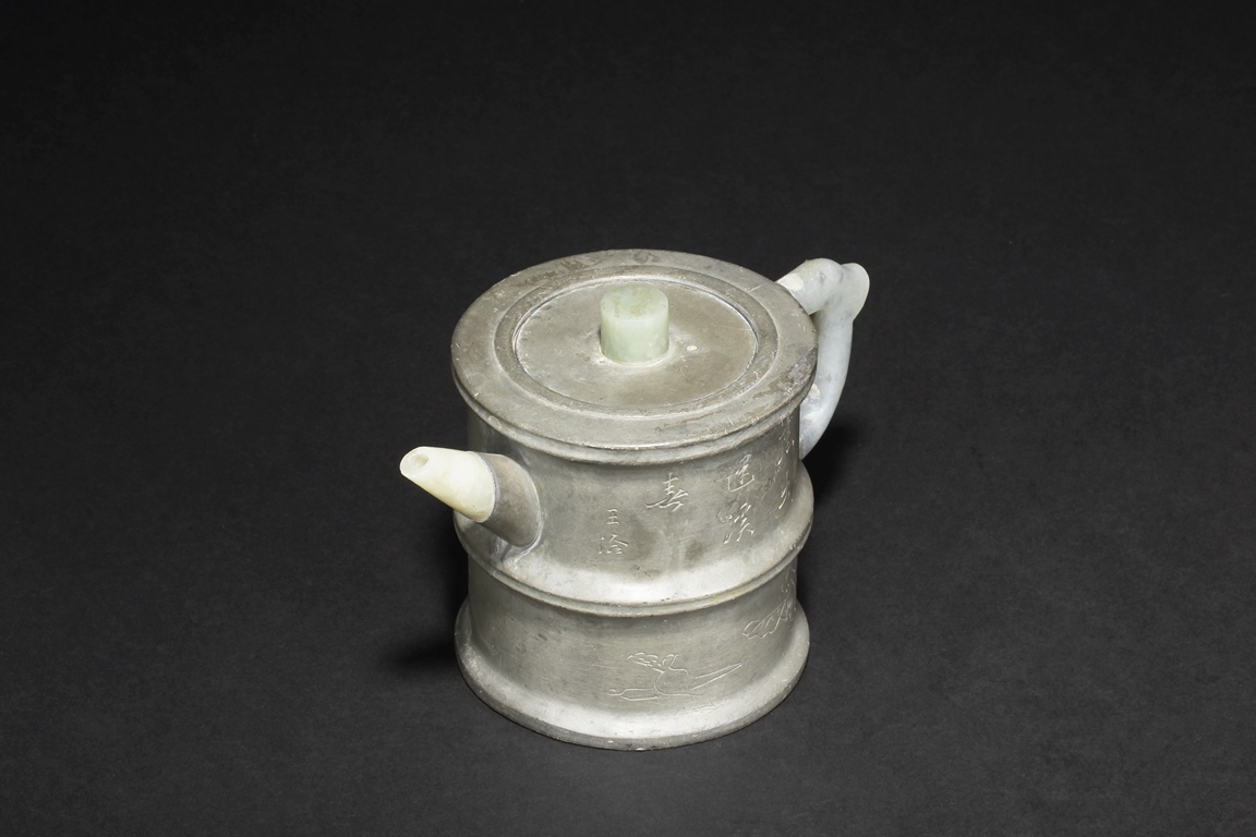 Of cylindrical bamboo sections form, with the exterior encased in pewter, incised with calligraphy, cabbage, radish, and bamboo. The handle, spout tip, and finial all made with jade, the lid with insertion design.